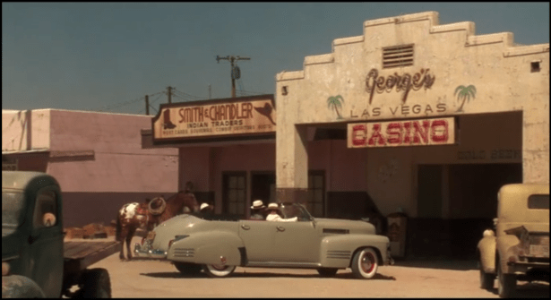 In the film, Virginia Hill, Siegel and Cohen go to Las Vegas. The depiction of Vegas as a sleepy berg with dirt streets and run-down casino is a far cry from reality. Wartime Las Vegas was booming. Siegel’s LA rivals, Guy McAfee, Tutor Scherer and Farmer Page, had established legitimate casinos downtown on Fremont Street by 1942. Siegel’s interest in Las Vegas was related to the race wire. Nevada had legalized off-track betting in 1941. Any Las Vegas casino that wanted to offer betting on horse races had to subscribe to the Siegel-controlled race wire. Moe Sedway (who has a fictional counterpart in Bugsy) fronted for Siegel in this venture. See my previous post on the race wire situation.