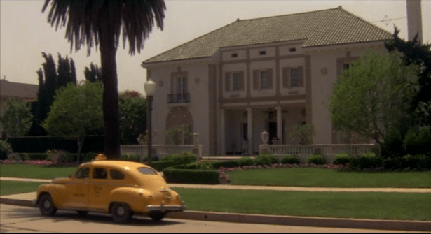 As the film continues, Harry Greenberg arrives at Siegel’s house in a taxi. Siegel takes him for a ride. In real life, as noted previously, Harry Greenberg was murdered in November 1939 while sitting in his car parked out in front of his house. He’s been hiding out from Siegel and the New York mob- he certainly wouldn’t seek out Siegel! His presence in Hollywood was inadvertantly exposed by the LA Times, when it ran a human-interest story about the chance meeting of Greenberg’s wife and her long-lost sister at the corner of Hollywood and Vine- conveniently listing Greenberg’s address in the piece. As Siegel is seen reading the paper so often in Bugsy, this would have been a fabulous and more true to life scene to recreate- though problematic since Bugsy’s Harry Greenberg is sort of a combo of both Harry Greenberg and Abe Relles and therefore could not be both the murder victim and witness who could link Siegel to said murder.