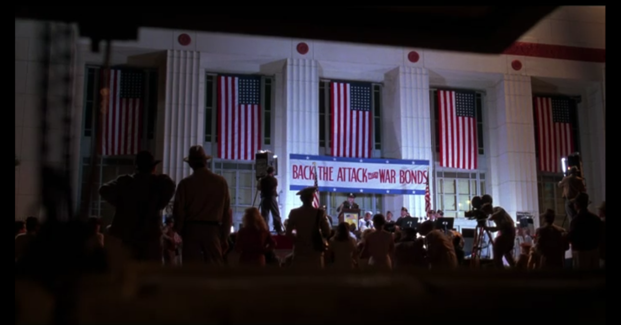 In this scene, Bugsy observes a “Back the Attack” war bond rally going on across the street from Dragna’s bookie joint. “Back the Attack” was the real slogan of the 1943 war bond drive, which kicked off in September of that year.