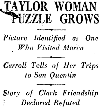 On July 10, Taylor was acquitted in the hotel registration case when the prosecution was unable to locate the witnesses. But her victory was short- on the way out of court, she was handed a subpoena to appear before the grand jury about the Crawford – Spencer murder. Taylor appeared but refused to answer any questions on the grounds that it may incriminate her. The press reported that the jury was particularly interested in hearing about a supposed party Clark attended at a downtown club following Albert Marco’s first trial on the assault with a deadly weapon charge, which had ended in a hung jury. Prosecutors had heard a story that Clark was photographed in a compromising position and the photos would be used against him if he pursued the case against Marco. If true, it was a set up not unlike the one Crawford, Marco and others had contrived against the vice crusading City Councilman Carl Jacobson in 1927. Taylor previously told Joseph Ford that she knew nothing about any party. And of course, Marco was ultimately convicted by Clark.