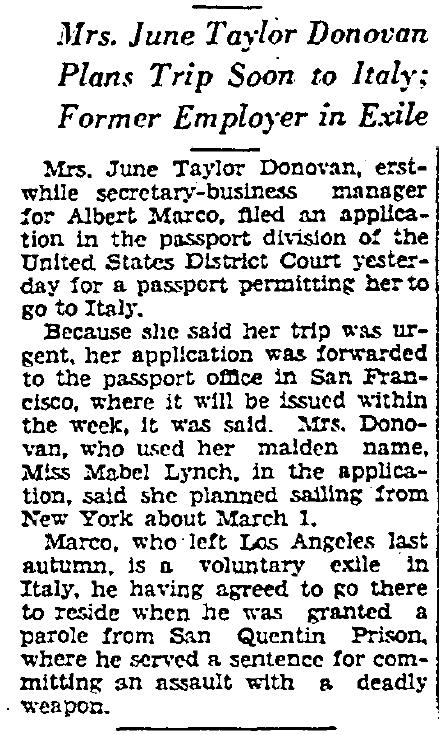 In February 1934, the LA Times reported that Taylor, identified as Albert Marco’s “business associate” had applied for a passport under her “maiden name” Mabel Lynch and was planning to travel to Italy on “urgent” business. She did indeed make the trip, returning via New York in September 1934.