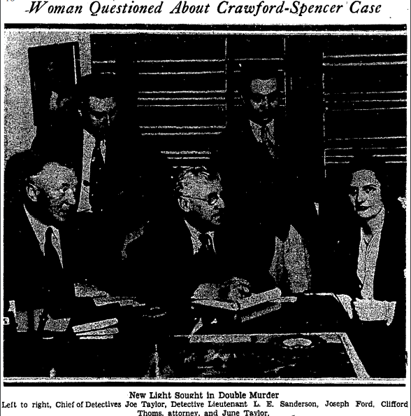 June Taylor being questioned. L-R: LAPD Chief of Detectives Joe Taylor, Det. Lt. Leroy E. Sanderson, Joseph Ford, Taylor’s lawyer Clifford Thoms, Taylor. LAT photo.