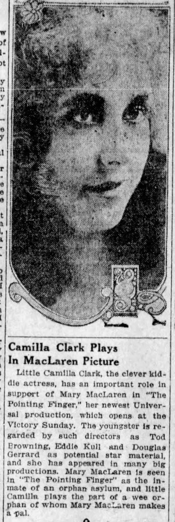 Dorothy and Elms separated on May 5 (Dorothy would annul the union later that fall). In the summer of 1922, the Clarks moved back to Hollywood to prepare for the Rawlinson lawsuit. They rented an apartment at 1645 North Harvard Street, managed by a lady named Ruth Clark (no relation). Ruth resided at 1645 with her husband Curtis and their three young daughters, Doris (8), Camilla (7) and Catherine Love (6). Camilla Clark, like Dorothy had been, was an established child bit-part performer at Universal.