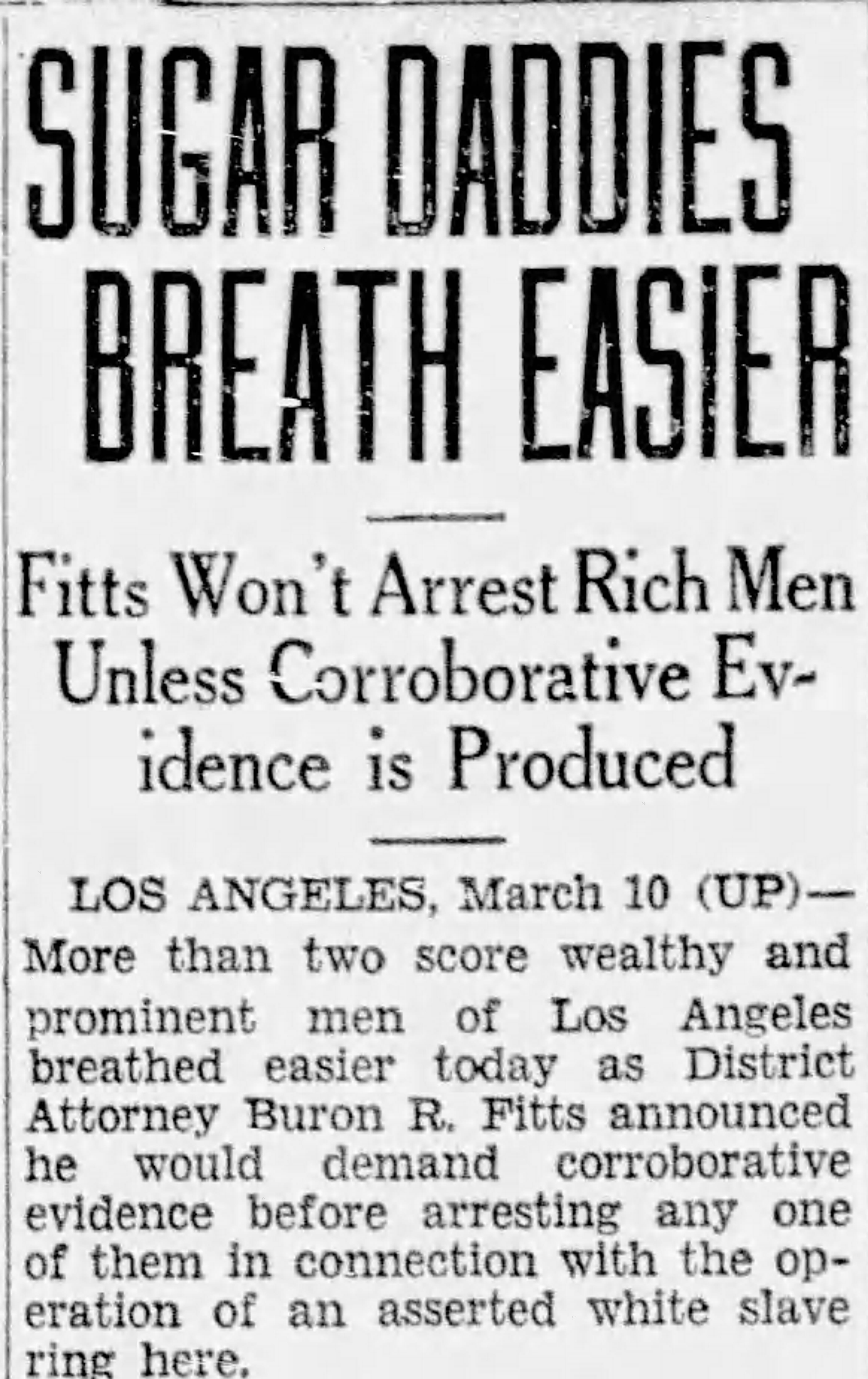 It would be ironic were Fitts to be charged with bribery. He’d gotten the job of DA in 1928 after successfully prosecuting his boss, Asa Keyes, for bribery.
