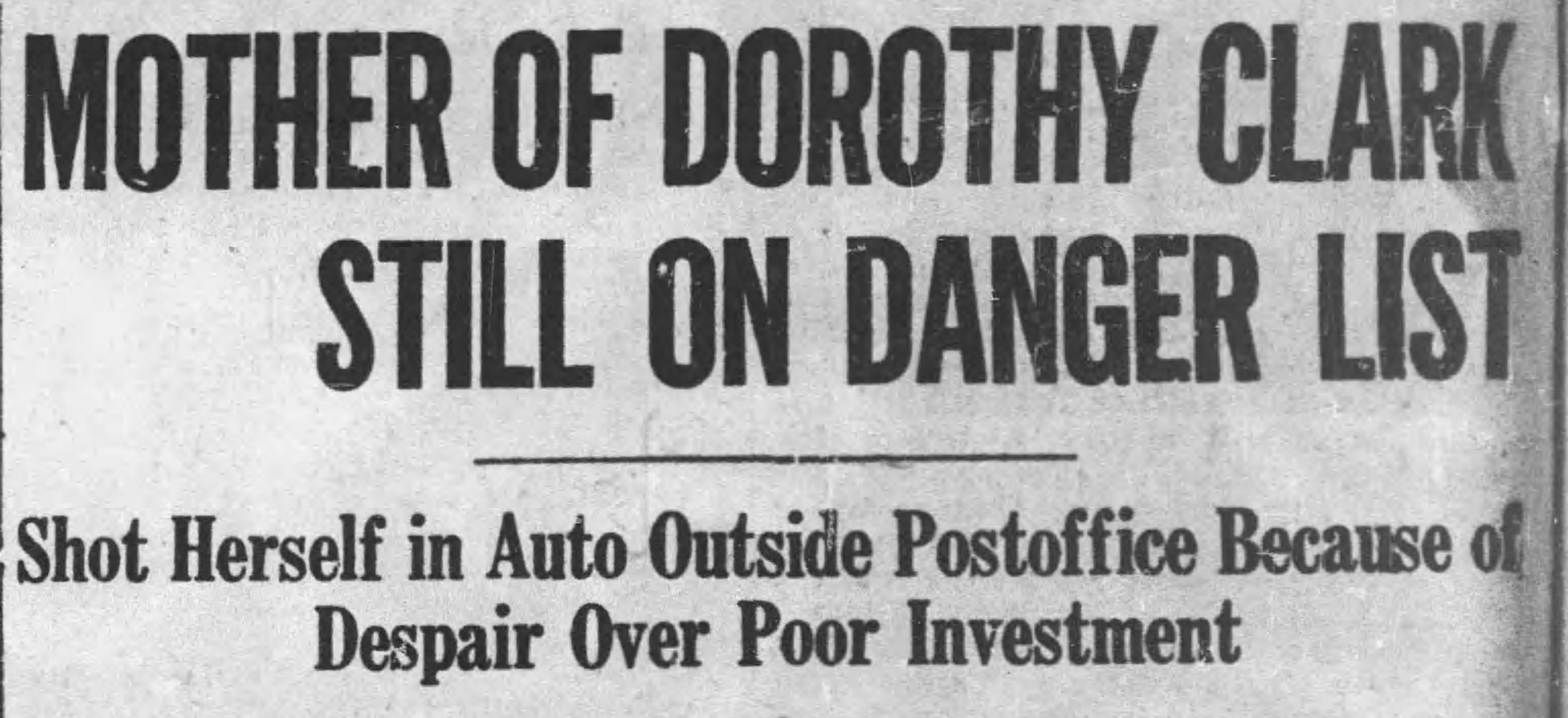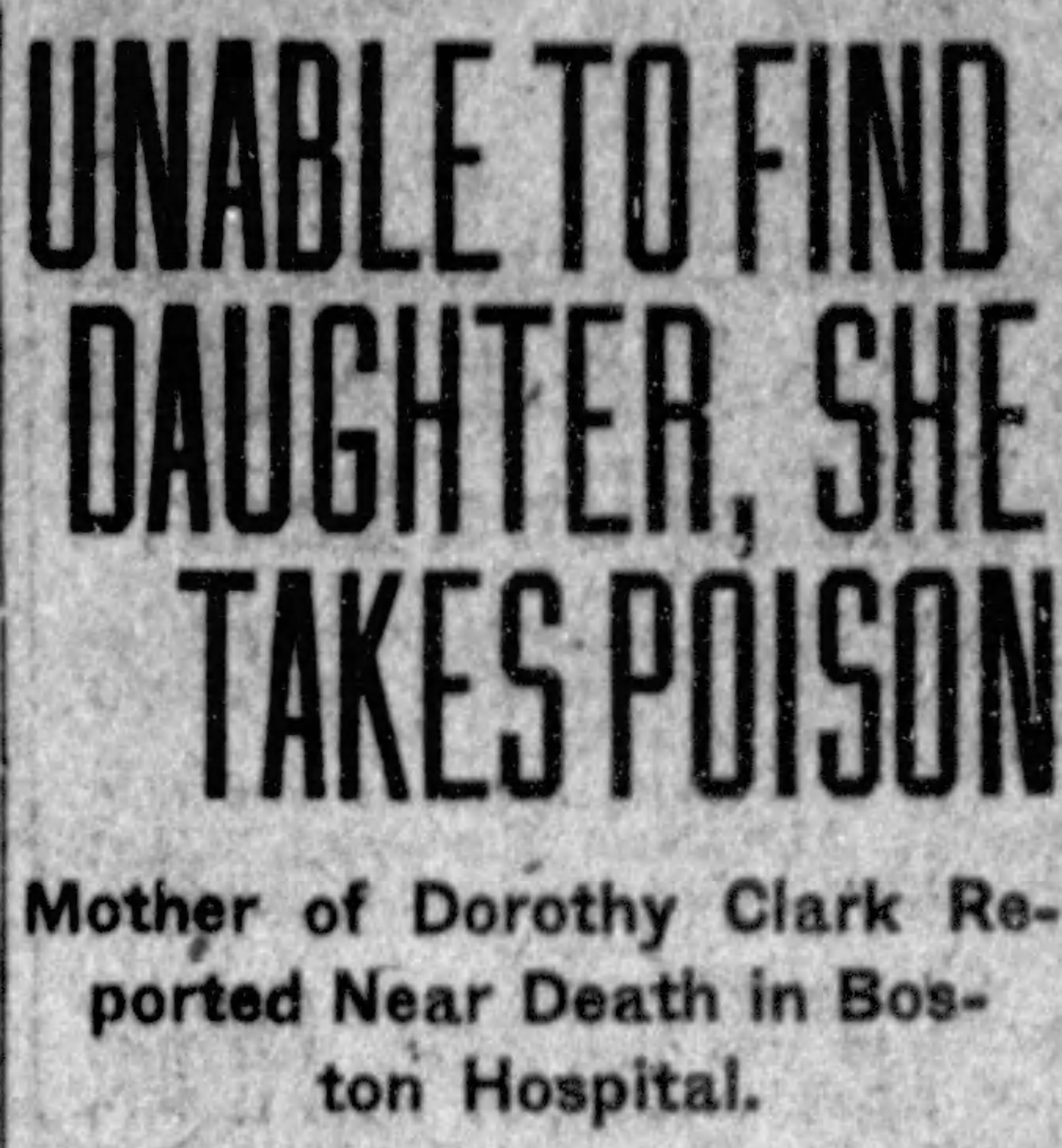 In Boston, Evelyn Clark heard of Dorothy’s marriage and searched frantically for her daughter. Unable to find her, she reportedly swallowed poison in an unsuccessful suicide attempt.