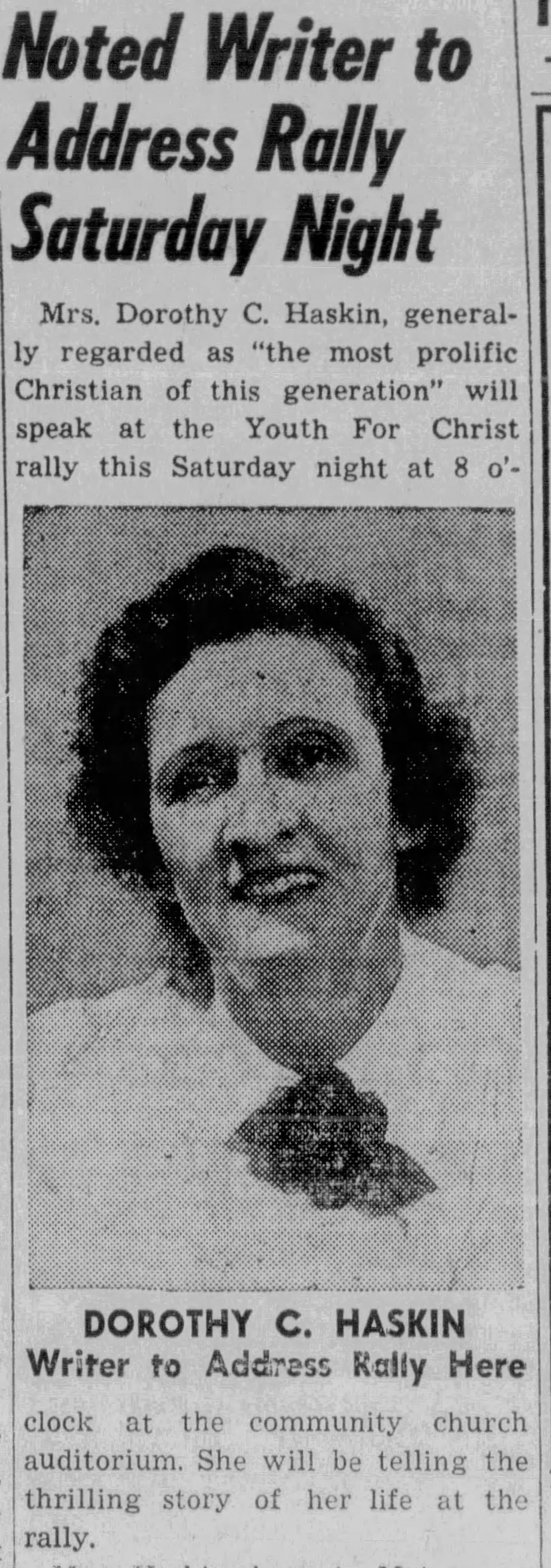 Dorothy told fictionalized versions of her life story for sympathy but clearly was not frank about her past. Hopefully she was legit about going straight, and wasn’t using Youth for Christ events as recruiting opportunities. The Big Bear Grizzly 7/23/1953