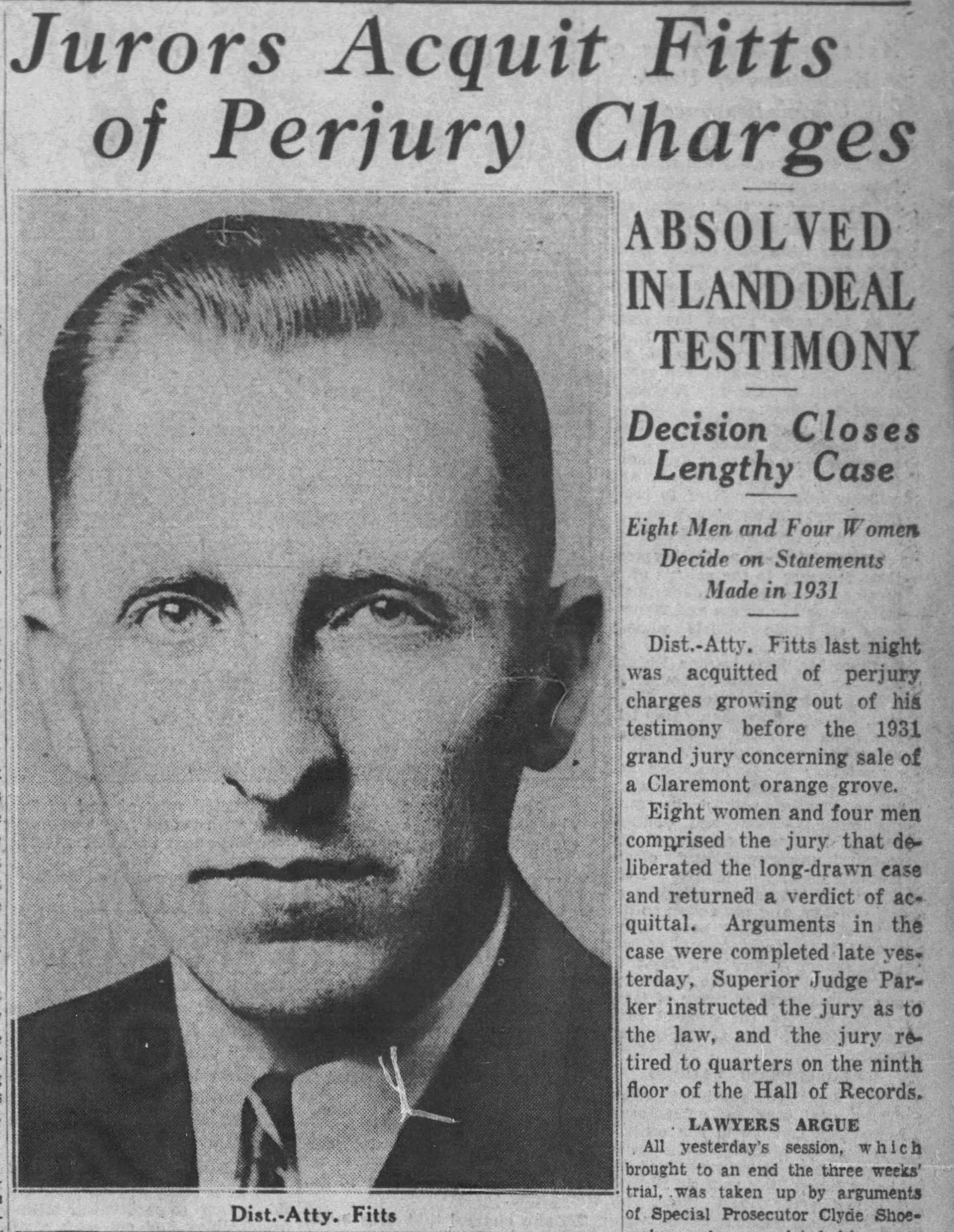 Fitts may have felt relief that it was all over, and confident at having been “cleared” by the 1931 grand jury. But then in August 1934, the LA Times sniffed out that the 1934 grand jury, overseen by superior court judge Fletcher Bowron, was looking into potential perjury committed during the 1931 grand jury investigation. Clyde C. Shoemaker was appointed special investigator.