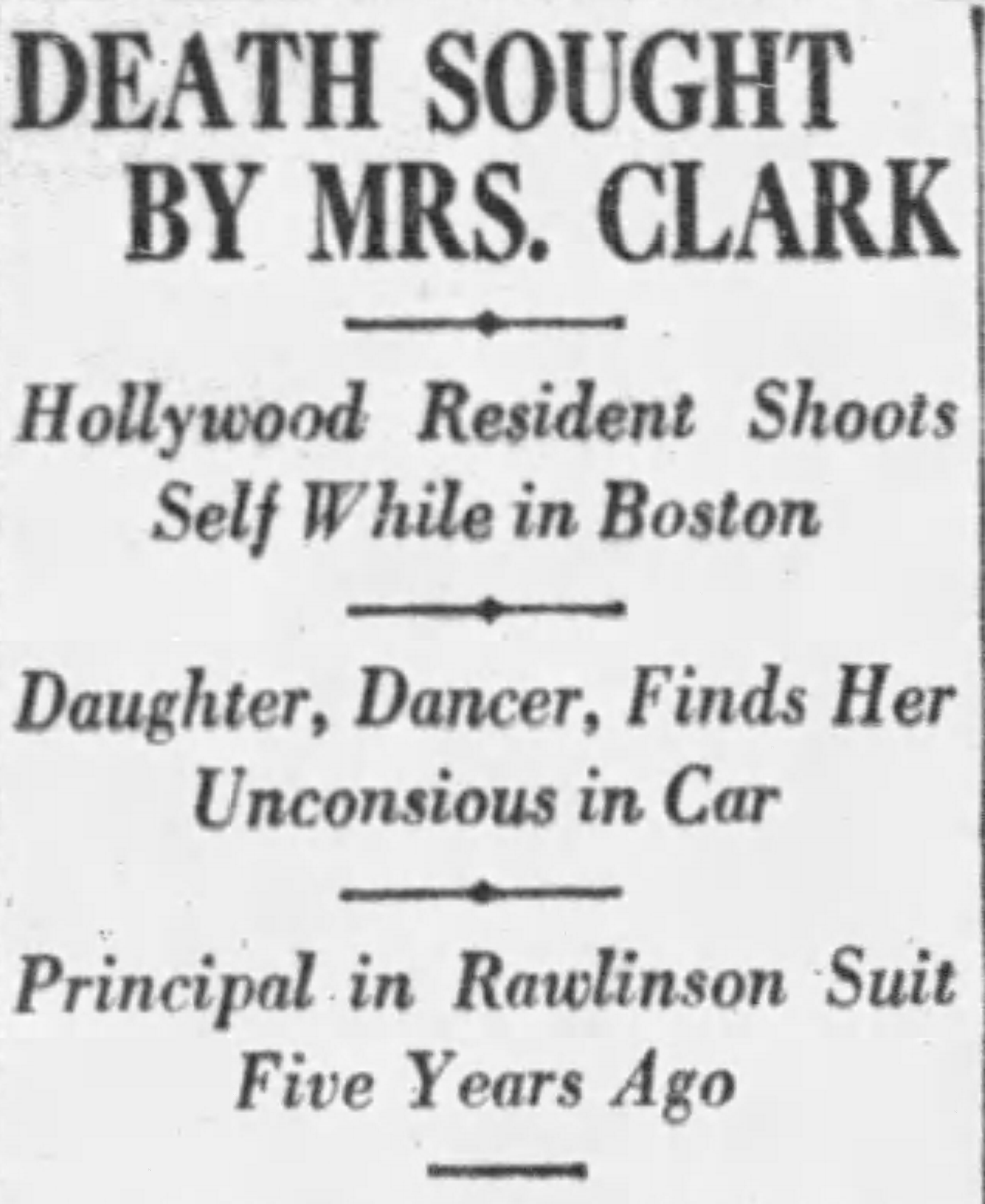 In October 1927, Evelyn Clark, still residing at the Glen Green house in Hollywood, made a visit to Boston. What happened there is sketchy as we only have Dorothy’s version of events. Evelyn ostensibly checked on some stock investments and found she’d lost her savings of $3400. She contacted Dorothy and threatened suicide. Dorothy rushed to Boston from New York to be with her mother. On October 14, they parked outside the Federal Building and Post Office. Dorothy left her suicidal mother in the car and went in to run an errand. She returned to find Evelyn dying from a self-inflicted gunshot wound.