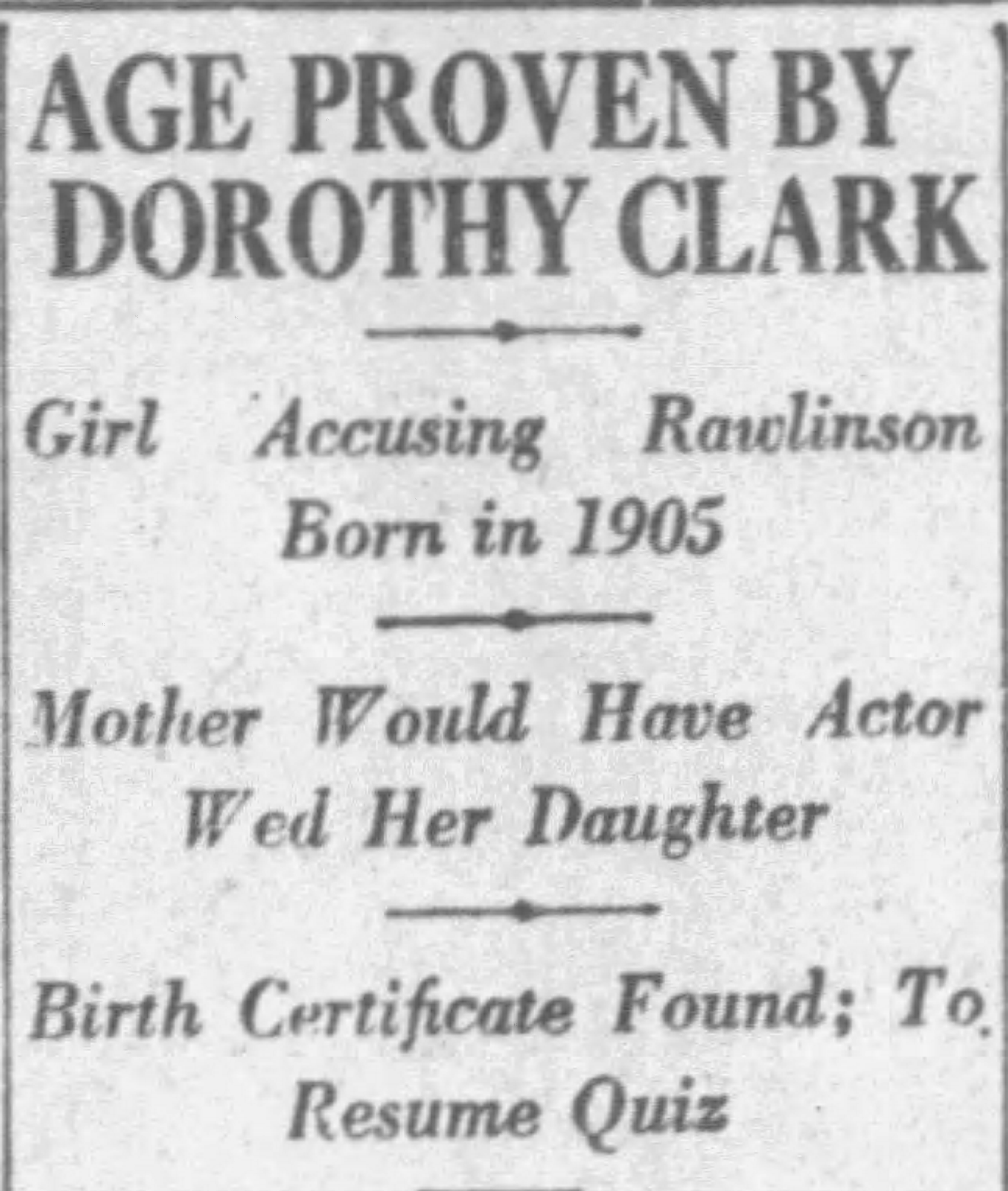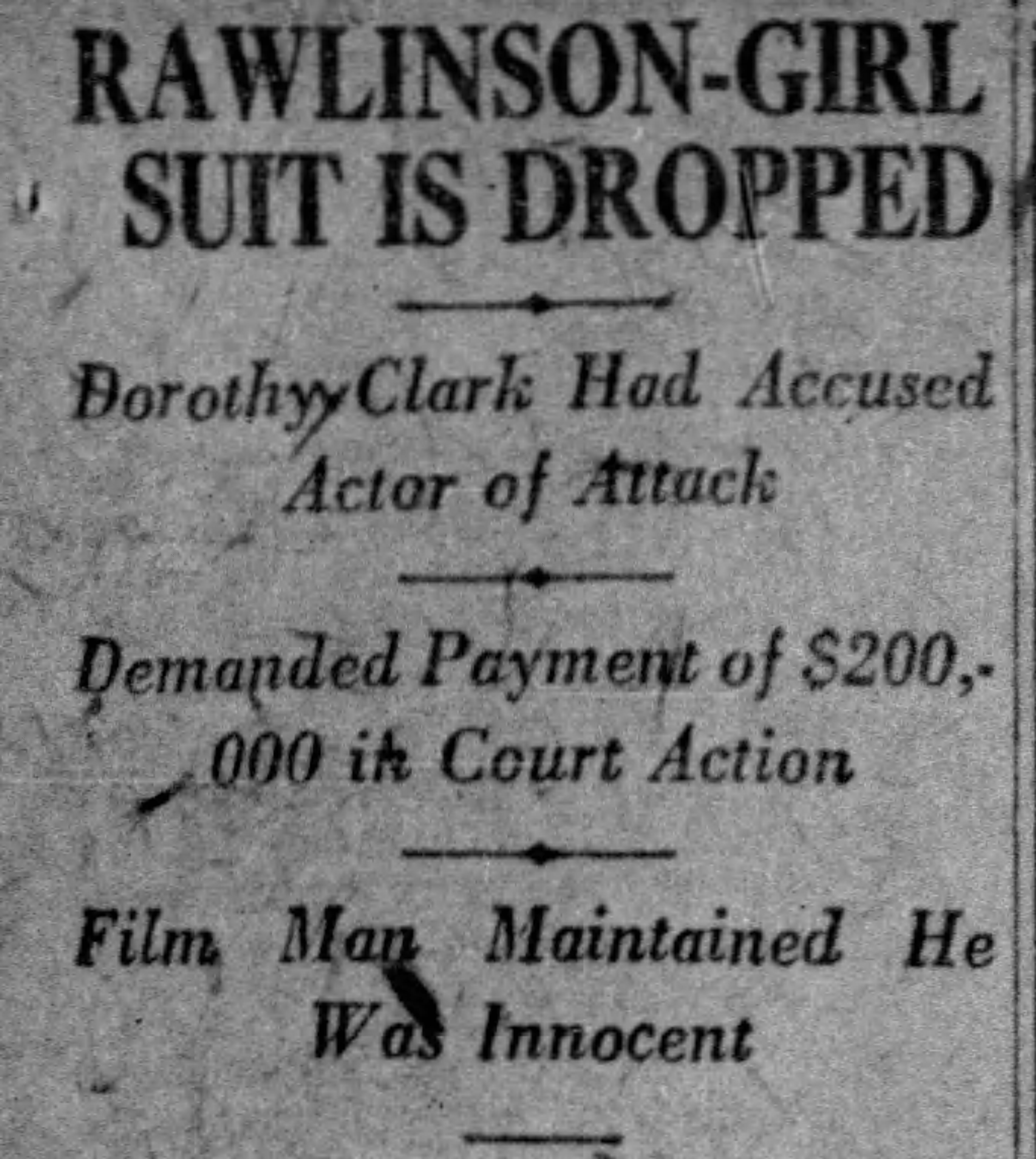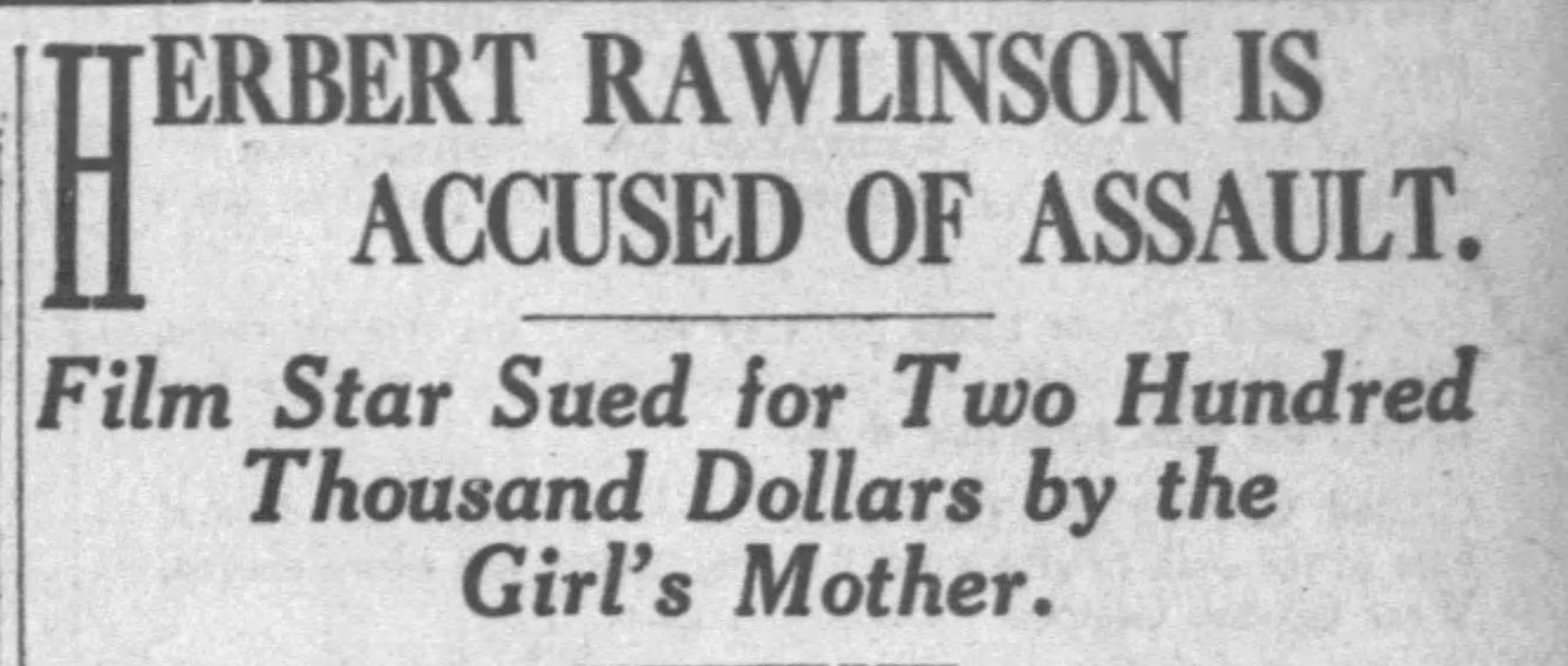 On March 28, 1922, Evelyn Clark, then living in Boston, filed a $200,000 lawsuit against Herbert Rawlinson in Los Angeles through her California lawyer, accusing the actor of sexually assaulting Dorothy in New York on October 15, 1920.
