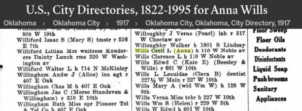 The young couple initially lived on North Broadway but later moved in with Cecil’s mother. On October 6, 1917, Anna Wills (as she was now known) and Cecil had a son, Maurice Cecil Wills (sometimes spelled Morris). But the relationship was rocky. Anna and the baby went to live with Minnie, who as “Mrs. Minnie Tate” had since also relocated to Oklahoma City.