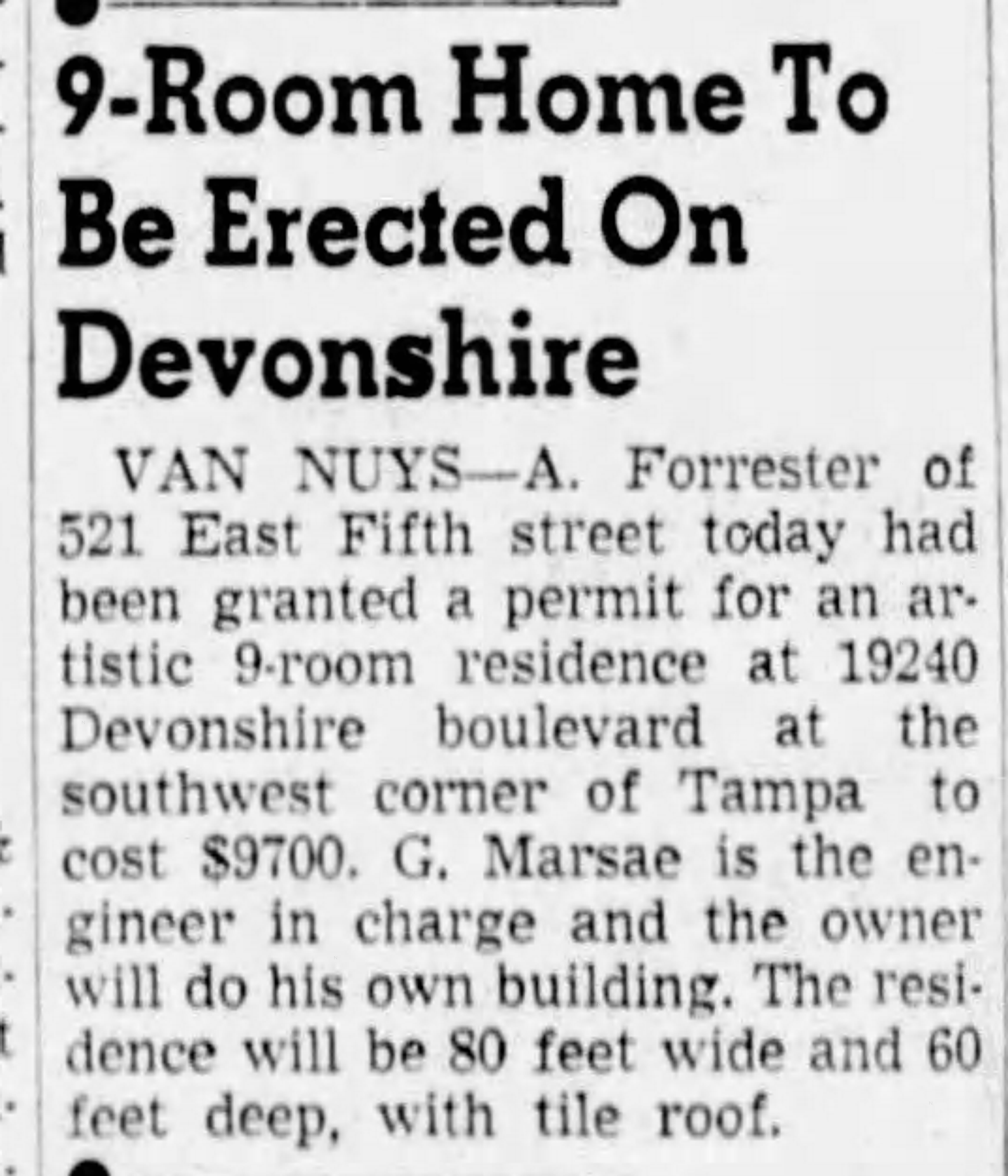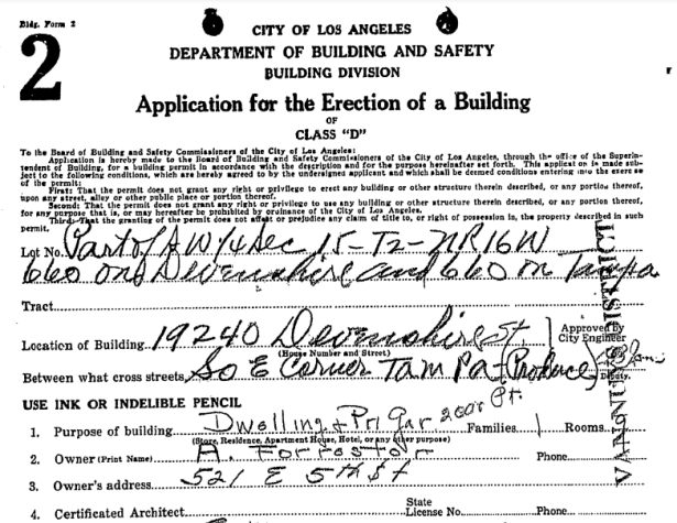 She was apparently doing well. In August, 1938, as “Mrs. A. Forrester,” Ann purchased a 10 acre plot of land in Northridge and in November obtained a permit to built a sprawling hacienda-style house on the property. Later, Guy McAfee would claim he had only met Ann once and that was in connection with the construction of this house- the builder had wanted to consult him about it, or some such malarkey.