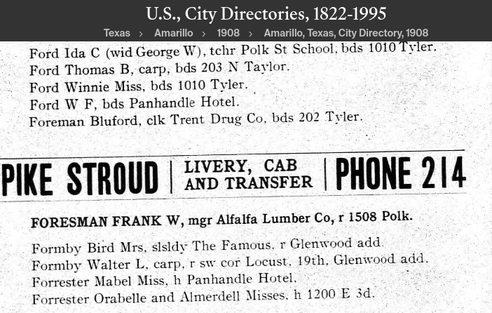 The 1908 Amarillo City Directory. Almerdell’s brother Orville Forrester is mistakenly listed as a girl, “Orabelle.” The three siblings lived with their mother (listed as Minnie Mardis) at the Panhandle Hotel.