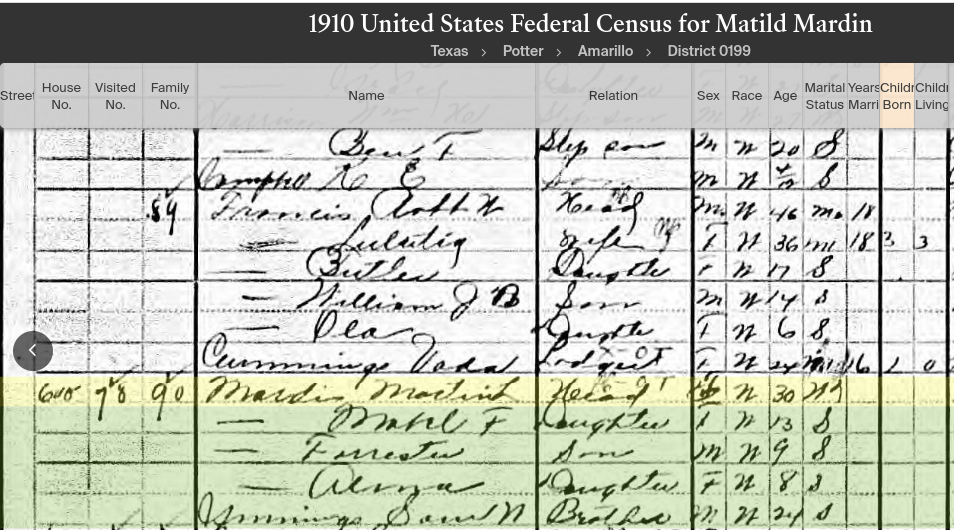 The 1910 US Census. Minnie was still using the name Mardis (incorrectly transcribed as Mardin) and here it is also applied to the children. Orville is listed is Forrester” Mardis. Eight-year-old Almerdell is “Alma” Mardis.