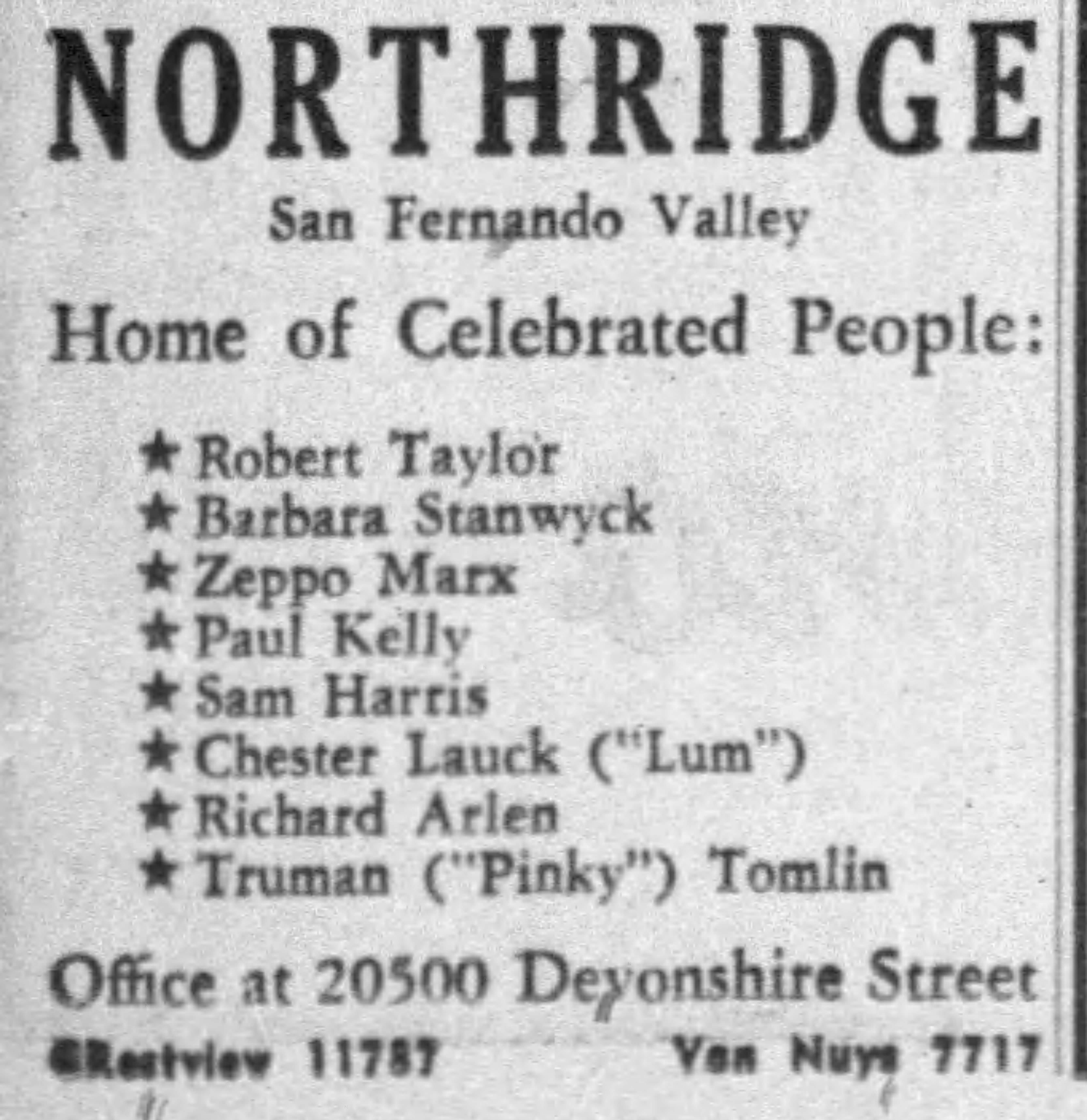 In November 1936, Barbara Stanwyck and her agent Zeppo Marx had purchased a 130-acre tract at the southwest corner of Devonshire and Reseda boulevards that they planned to develop as a thoroughbred race horse ranch, known as “Marwyck.” In February they applied for permits to build homes fronting Devonshire Road- Stanwyck at 18050, Marx at 18600.