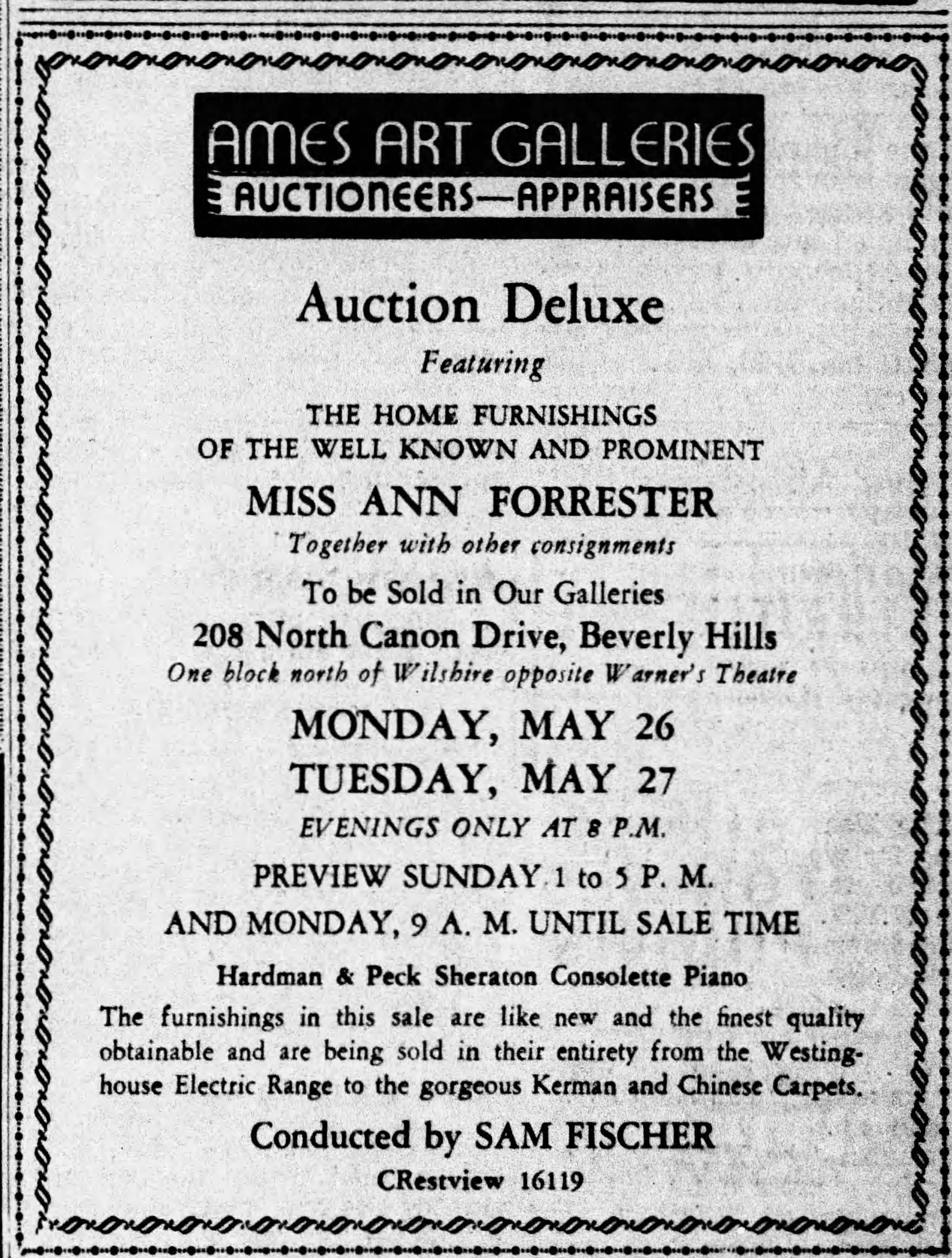 The “well known and prominent” Ann Forrester’s interior decor was sold an offsite auction in May 1941. LAT 5/25/1941