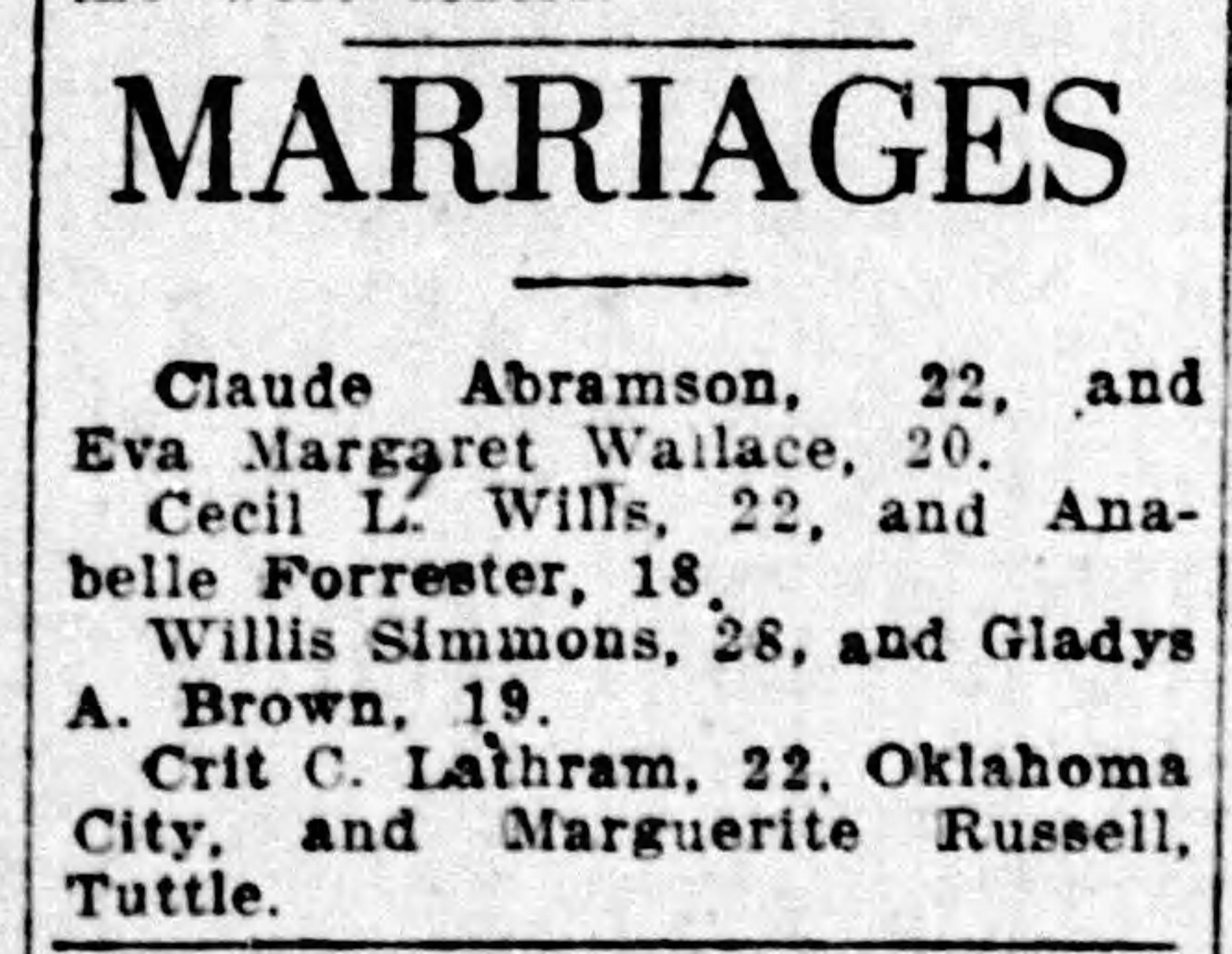 Mabel married in Oklahoma City in December 1915. Almadell, now calling herself “Anna Bell” Forrester (sometimes spelled Anna Belle, Anabelle, Annabelle or Annabell) also moved to Oklahoma City, where she worked as a waitress. On May 26, 1916, she married a local man, Cecil Leland Wills, a movie theater projectionist. He was 22. She gave her age as 18. In fact, she was not yet 14.