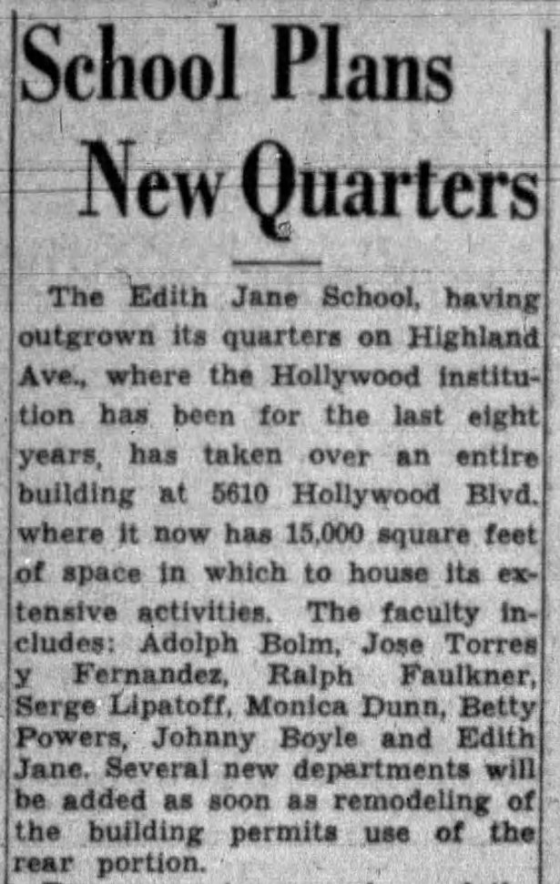 The Edith Jane School moved to 5610 Hollywood Boulevard in April 1937. Hollywood Citizen News 4/10/1937.