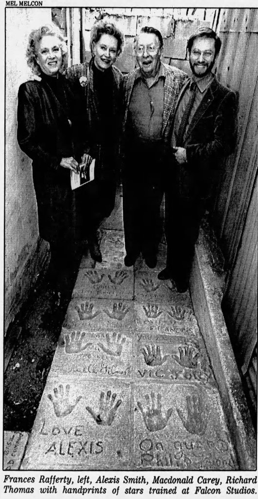 In June 1943, the Falcon Studios made the move to 5526 Hollywood Boulevard, The new quarters featured a large outdoor stage and theater, covered by a canopy, as well as a garden, a “Victory Garden” or World War II.. Famous students would press their handprints and autographs, into the cement of the walkways, a’ ‘la Grauman’s Chinese Theater.