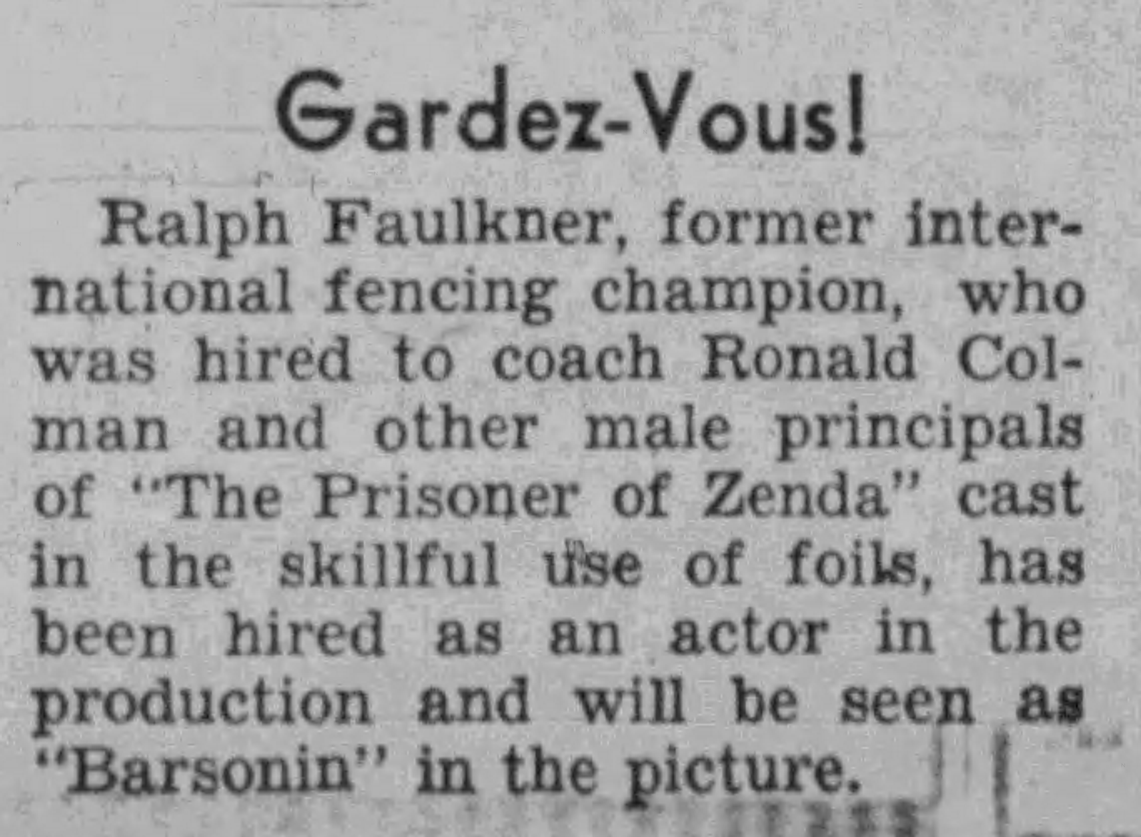 Faulkner, who had appeared in minor roles in silent films, was hired by David Selznick to instruct Ronald Colman on swordplay for his production of “The Prisoner of Zelda” (1937). He also appeared onscreen in the film (uncredited).