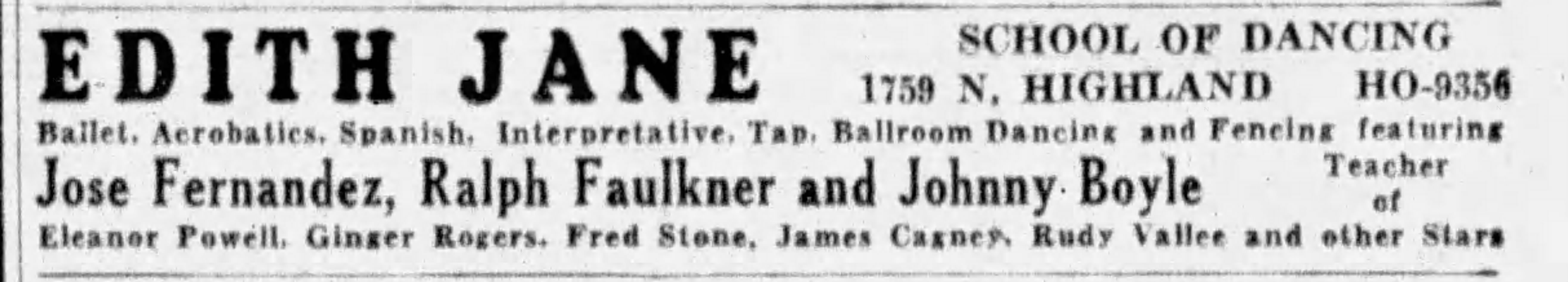 Falcon Studios originated as the Edith Jane School of Dance, founded by Edith Jane Plate in March 1929. The school’s first home was 1759 N. Highland Avenue.