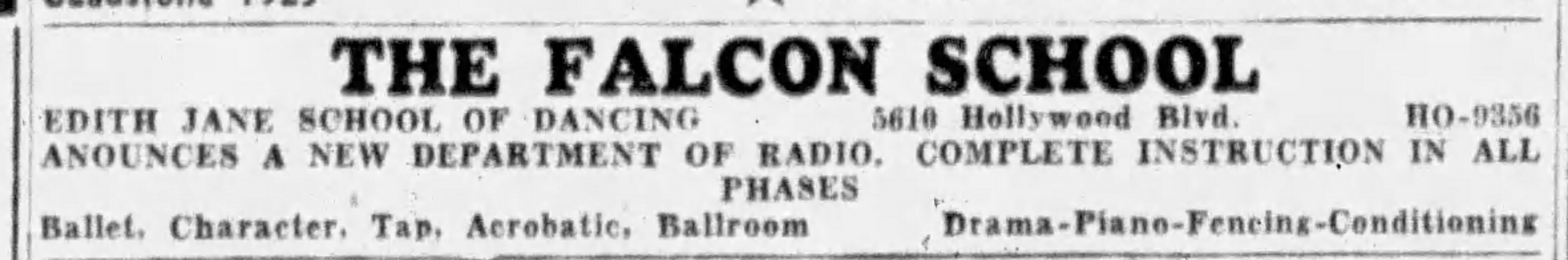 In January 1938, the Falcon School added radio classes to its curriculum. Student made regular broadcasts over local radio. Hollywood Citizen News 1/22/1938