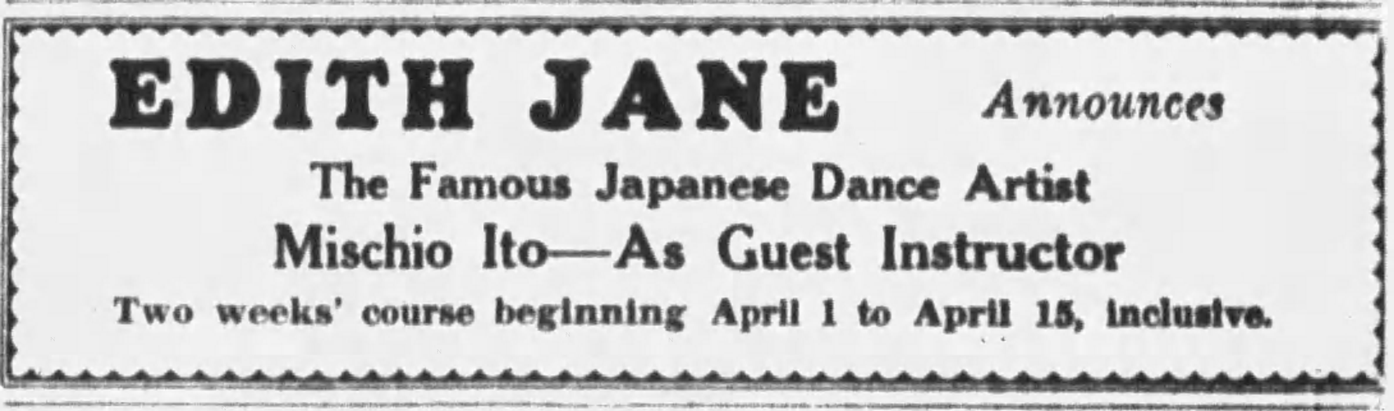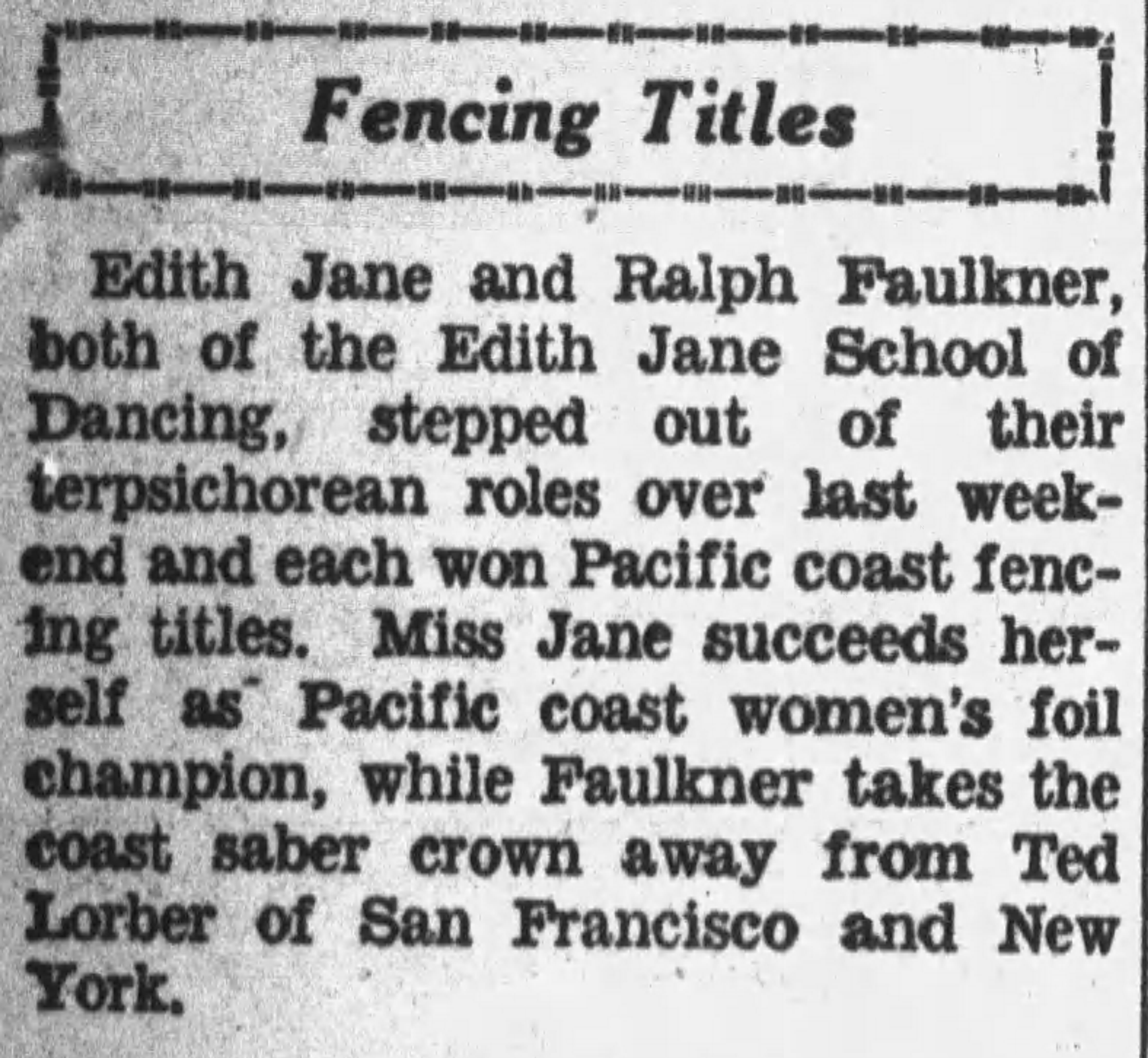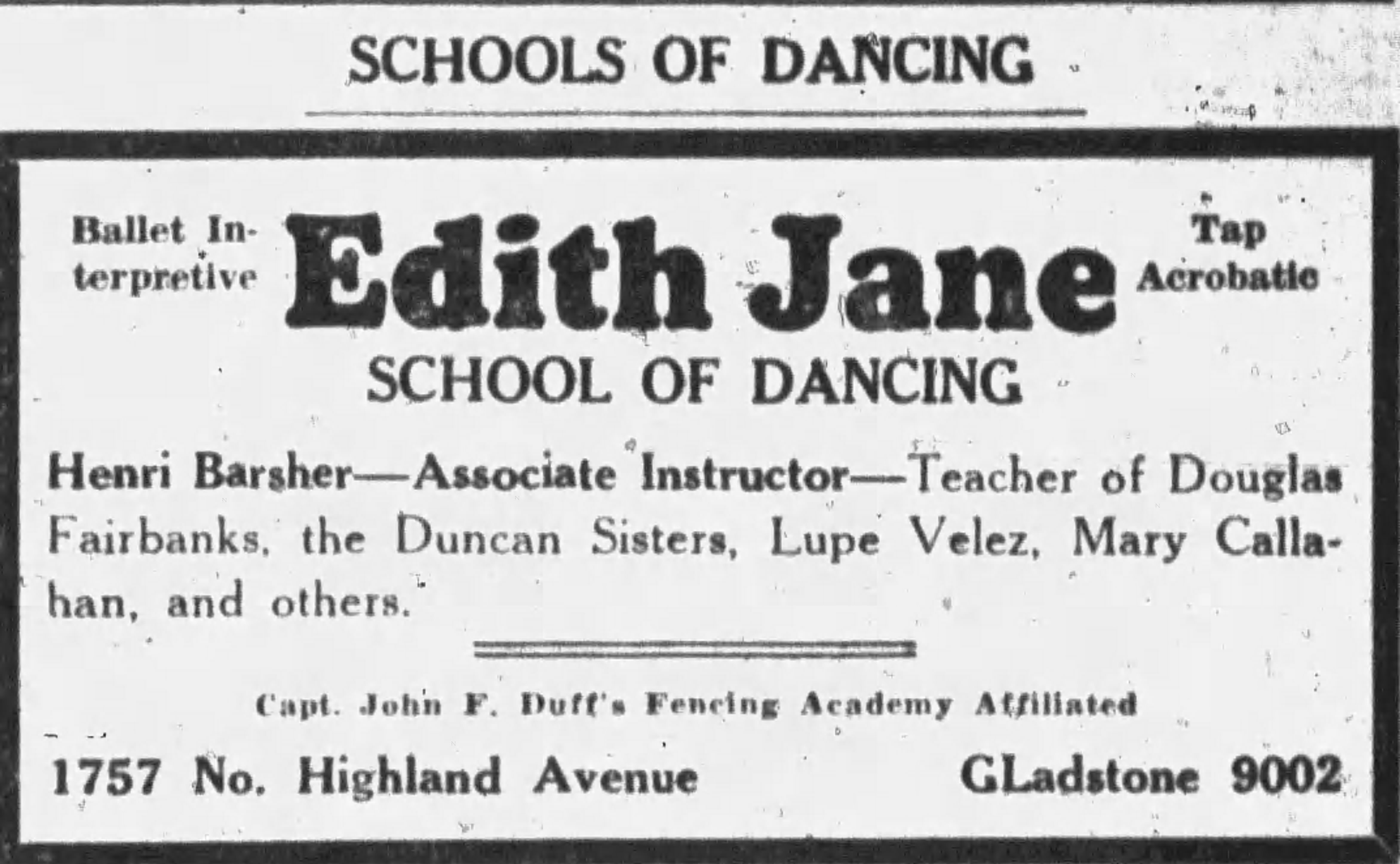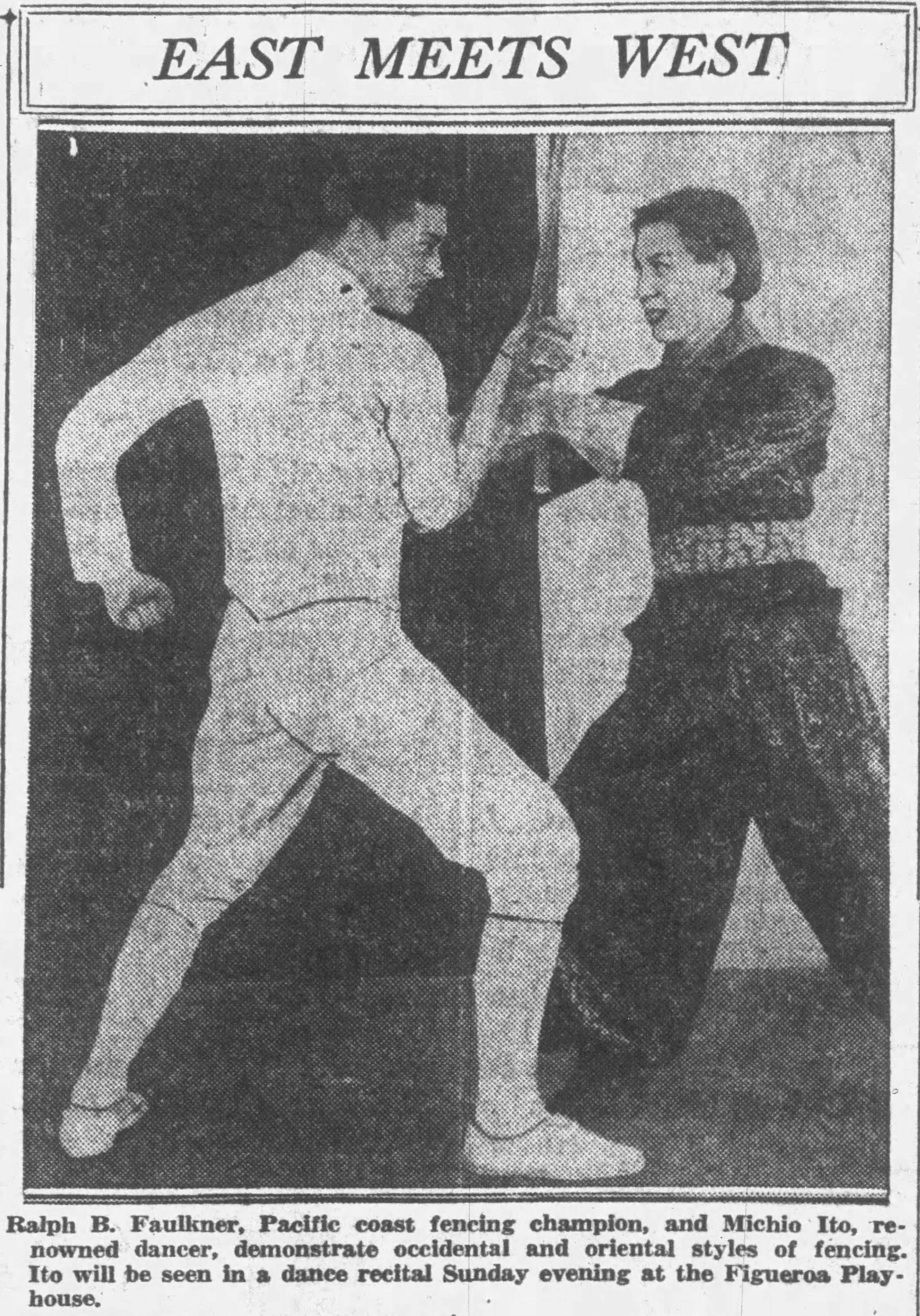 The Edith Jane School’s regular instructor was Henri Barshow, instructor of swashbuckler Douglas Fairbanks, Sr. For fencing instruction, the school was affiliated with Captain John F. Duff’s Fencing Academy. In April 1929, the school invited Japanese dancer Michio Ito as a guest instructor. Ralph B. Faulkner, then the reining West Coast sabre champion and a participant in the 1928 Summer Olympics, met Ito at the studio and the two ultimately put on a recital at the Figueroa Playhouse, sponsored by Edith Jane School, to demonstrate “occidental and oriental” styles of fencing. In June 1922, Faulkner appeared with Edith Jane at the school’s Spring recital, held at the Windsor Square Theater.