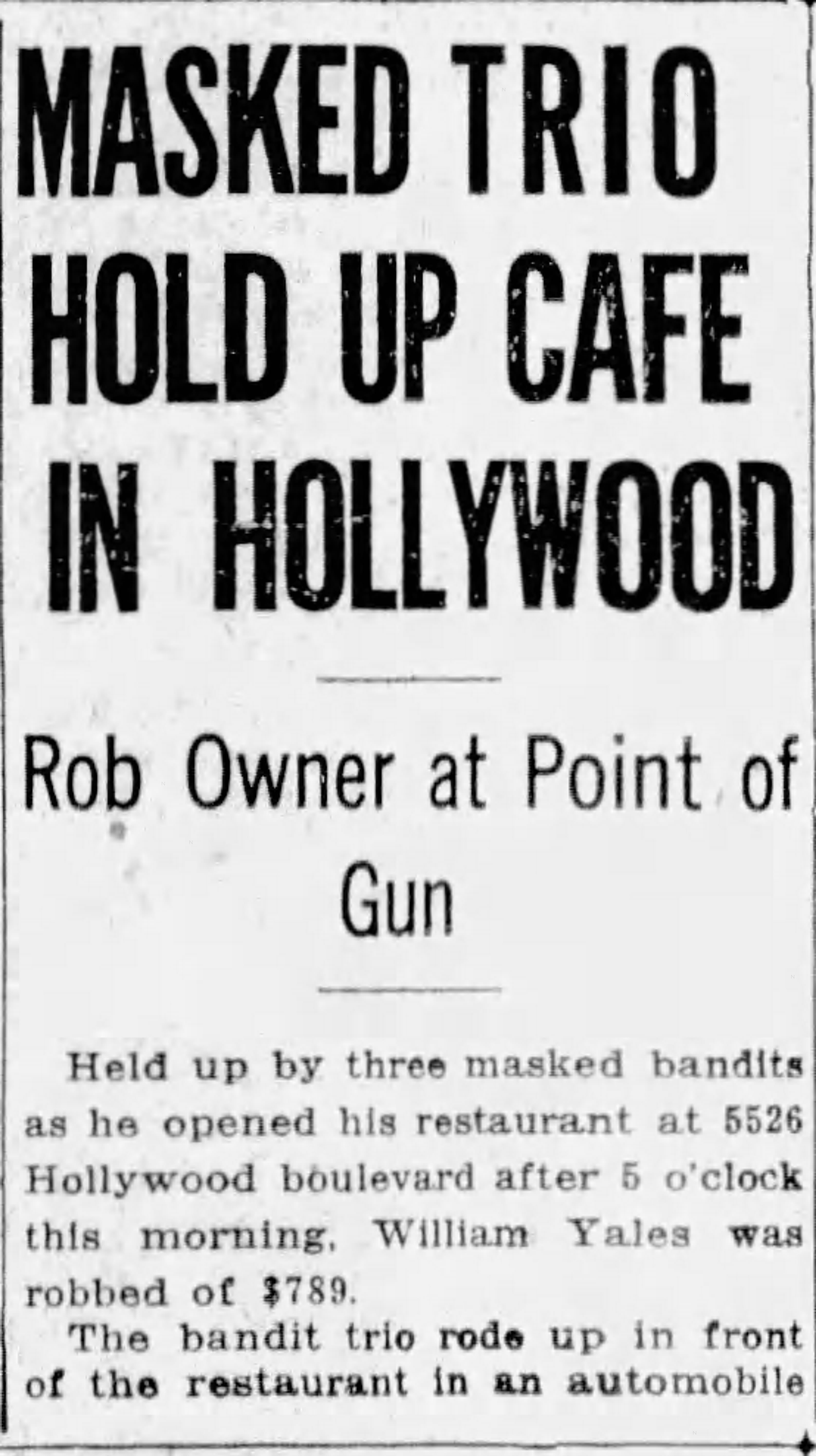 The cafe that succeeded Worth’s, run by William Yalen (not Yales) was also held up – this time by mobile bandits. LA Evening Express 8/11/1923