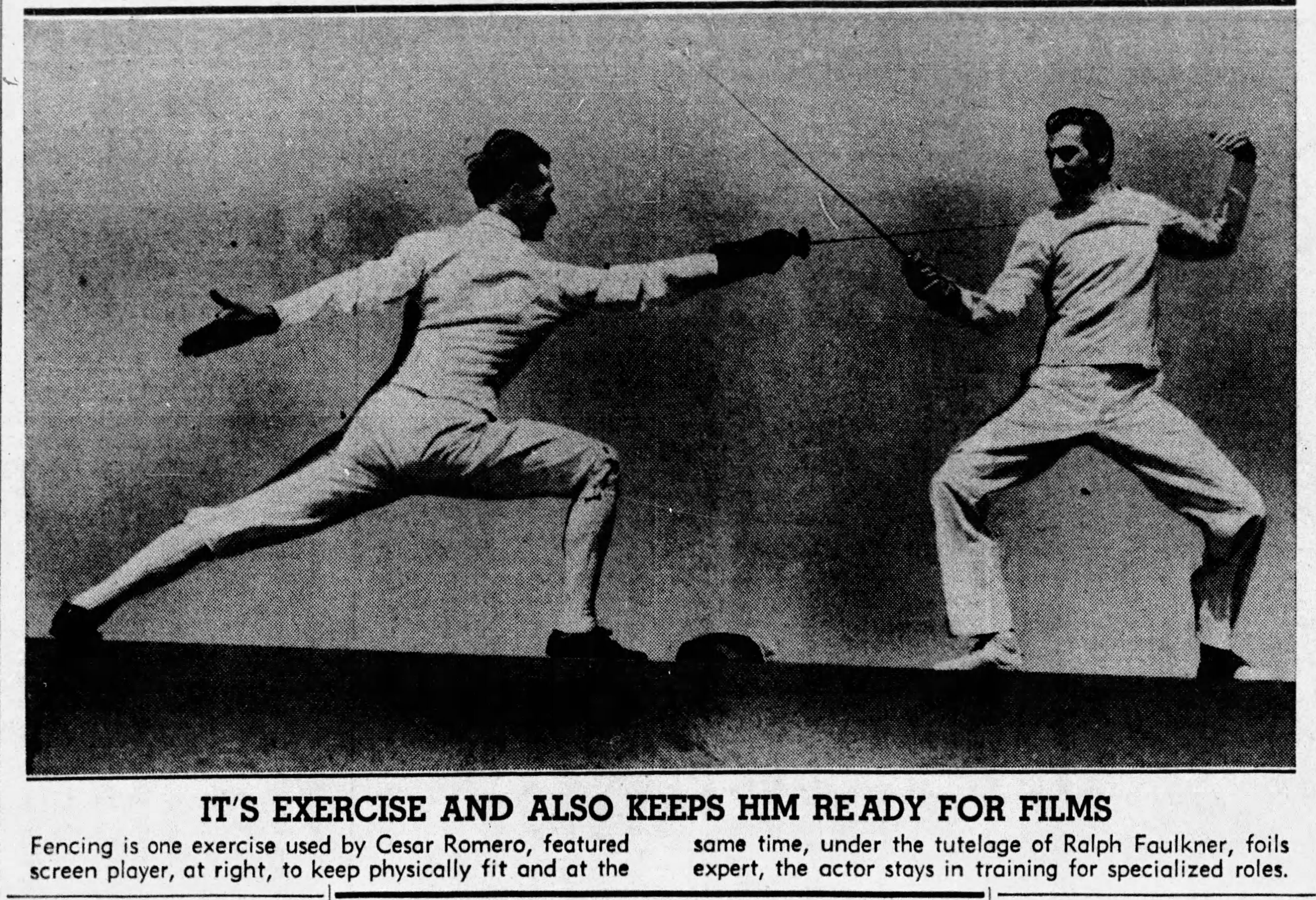 Increasingly known as fencing instructor to the stars since “Prisoner of Zelda,” Faulkner os seen here with Casar Romero. LA Times 7/11/1937.