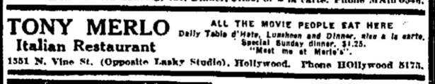 In August 1925, Tony Merlo, “Hollywood character and restaurant man” leased space on the first floor of the yet-to-be-completed building’s first floor, addressed as 1551 N. Vine, for a cafe serving Italian fare. Tony Merlo’s Italian Restaurant opened by December of 1925. Capitalizing on his Hollywood connections as well as the location, across the street from the Lasky/Famous Players studio, Tony promised that “all the movie people eat here.”