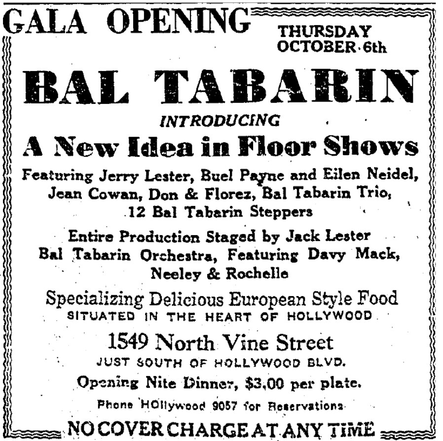 Gala opening of the Bal Tabarin 10/5/1932. LA Times.