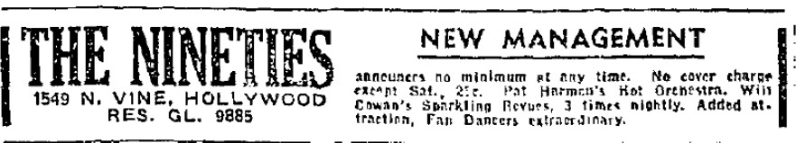 In March 1946, 335 N. La Brea was advertised as the new home of Charlie Foy’s club. The Foy/Donroy partnership collapsed at the last minute, however, and the club continued as the Donroy.