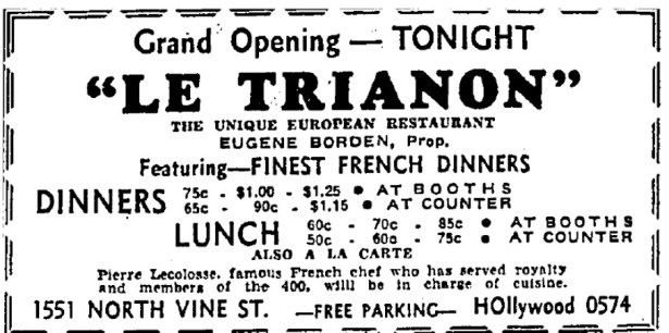 On May 30, 1935, 1551 N. Vine opened as Le Trianon. Again, it was operated by an actor, Eugene Borden and featured the decor and cuisine of Borden’s native France.