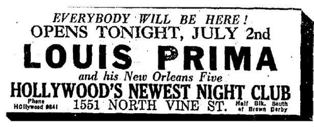 So new, it didn’t even have a name. Louis Prima debuts at “Hollywood’s newest” nightclub, 1551 N. Vine, 7/2/1937.