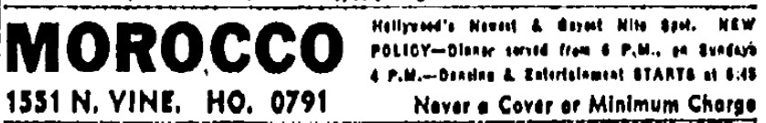 By early 1945, 1551 N. Vine had become the Club Morocco. The Morocco filed for involuntary bankruptcy in January 1948 and its fixtures and equipment were sold at auction the following month.