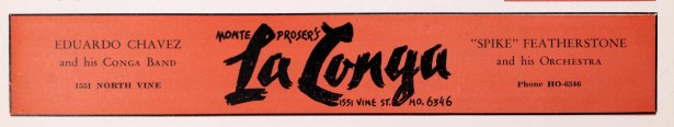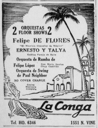 La Conga was a Hollywood nightclub that capitalized on the Latin music craze of the 1930s and early 1940s, which overlapped with the Hawaiian craze; in fact, the Hawaiian-themed Tropics nightclub was located just a few doors down.