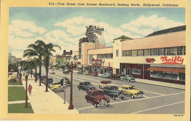 Postcard view of Vine Street at Selma c. 1948 showing the Thrifty Drug building and the maroon Vitrolite exterior of 1551 N. Vine.