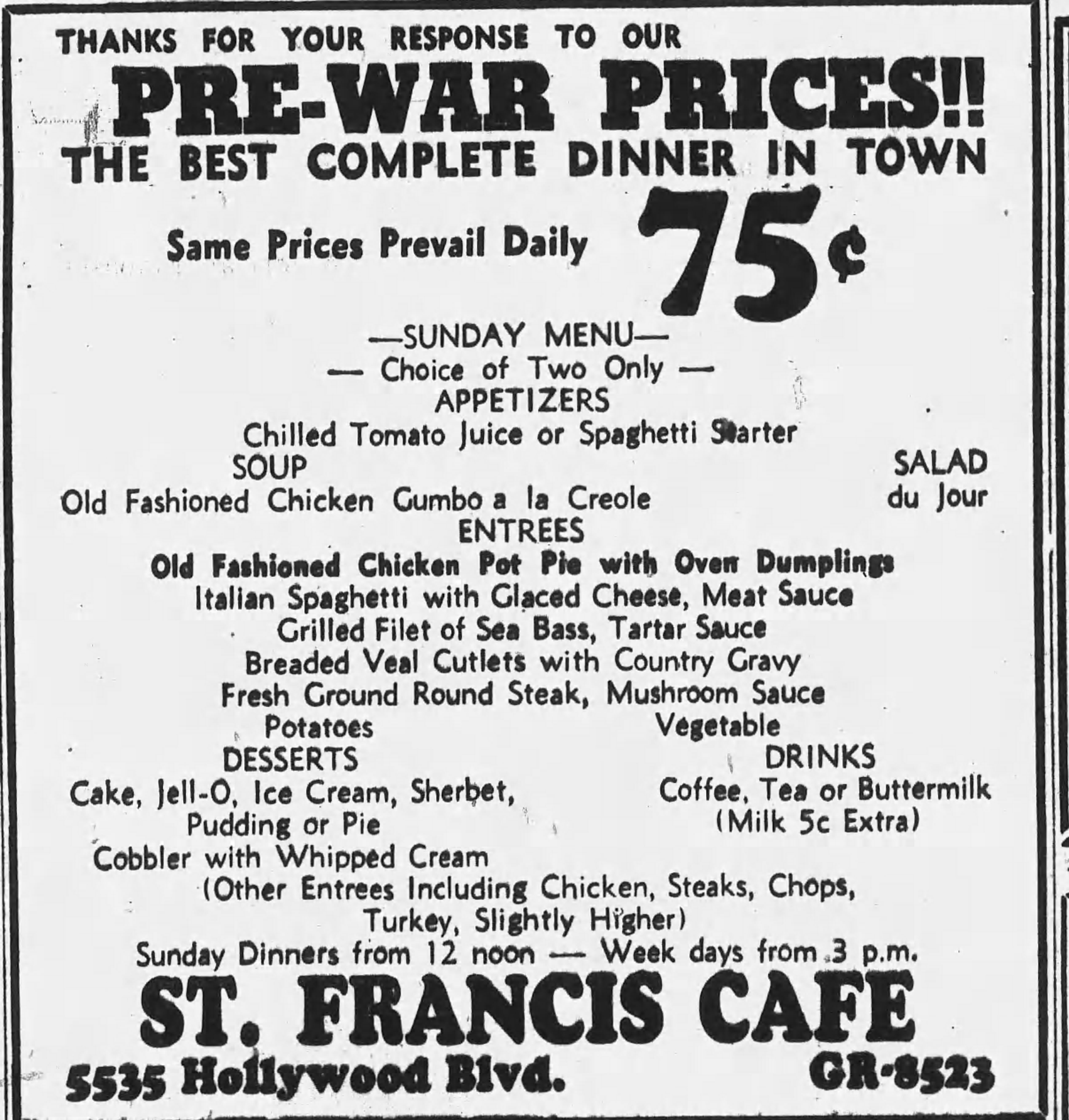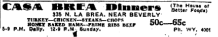 Le Trianon didn’t last too long. By April 1937, 1559 N. Vine was known as the Dominic Tavern, operated by Dominick Ferrera, when it made unfortunate publicity- an employee, Frank Damiano, was brutally murdered with a meat cleaver during his early morning shift, ostensibly by bandits. The case went unsolved. In June 1937, Ferrera pleaded guilty to adulterating and mislabeling liquors (LA Daily News 6/10/1937).
