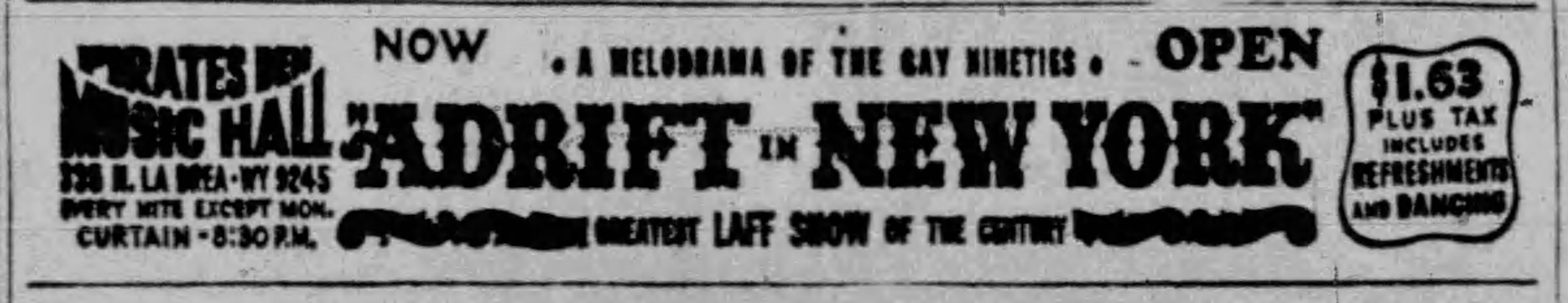 As “The Pirate’s Den Music Hall” for the run of the melodrama “Adrift in New York.” 4/6/1945.