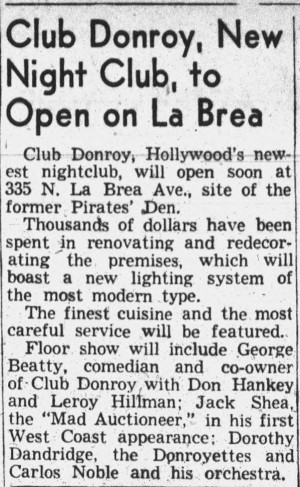 On August 21, 1945 the Hollywood Citizen-News reported that Don Hankey and Leroy Hillman of Donroy Aircraft Parts, and comedian George Beatty had purchased the old Pirate’s Den from Joe Bart and were revamping it. Their Club Donroy opened on October 9, 1945.