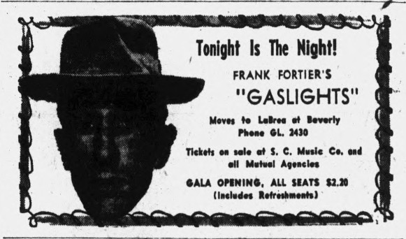 On October 14, 1947, 335 La Brea again became a venue for a Gay 90s themed theater as the new home of Frank Fortier’s melodrama “Gaslights.”