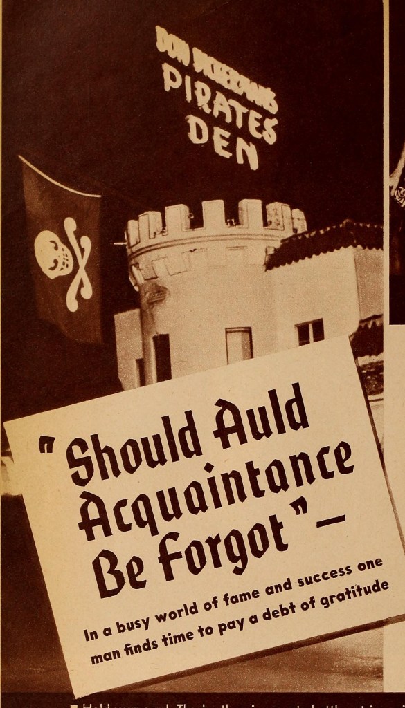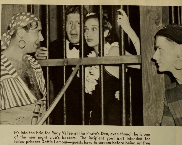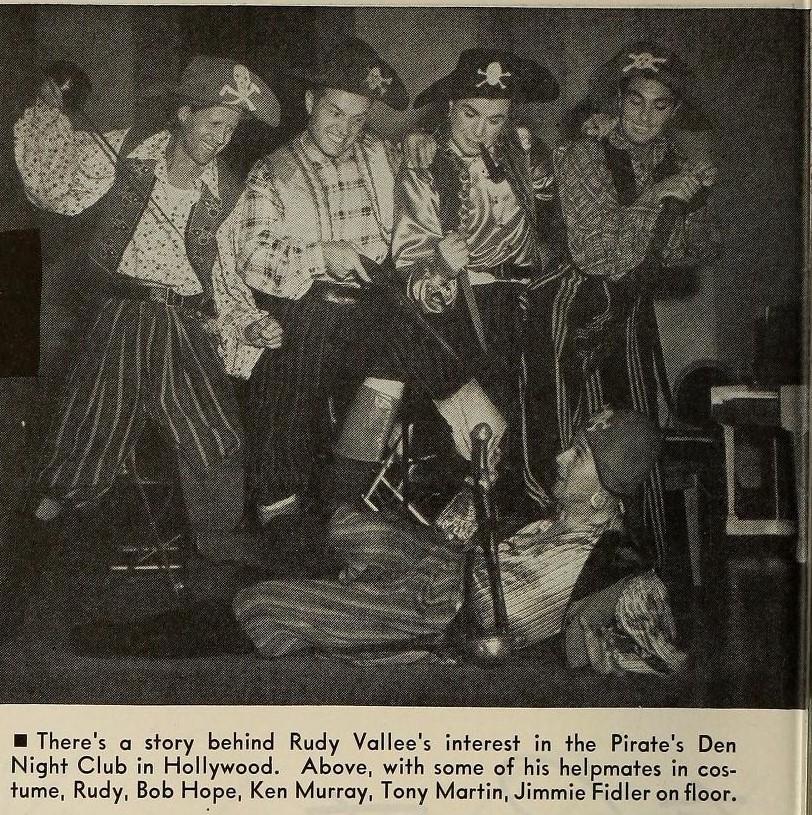 The Pirate’s Den would continue in business for several more years to come, though between the negative publicity and the US entry into World War II, its celeb backers were seldom referenced anymore.* In October 1943, the LA Daily News referred to Vallee et al as “former owners” and asserted that Joe Bart was the sole owner. Florabel Muir, in her syndicated column that appeared in the Hollywood Citizen News on April 6, 1945, said that bickering among the former owners caused them to start avoiding the place. Muir further noted that of the original group only Fred MacMurray still had an investment in the Pirate’s Den.