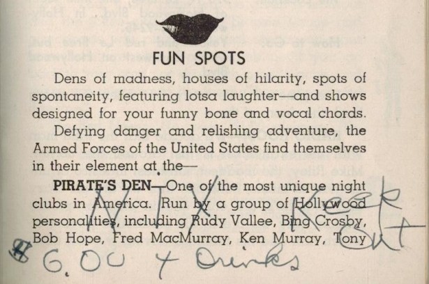 A soldier added his own review in a 1943 guidebook “Sinning in Hollywood” entry for the Pirate’s Den. The 1941 incident over $6 beers cast a long shadow. Author’s collection.