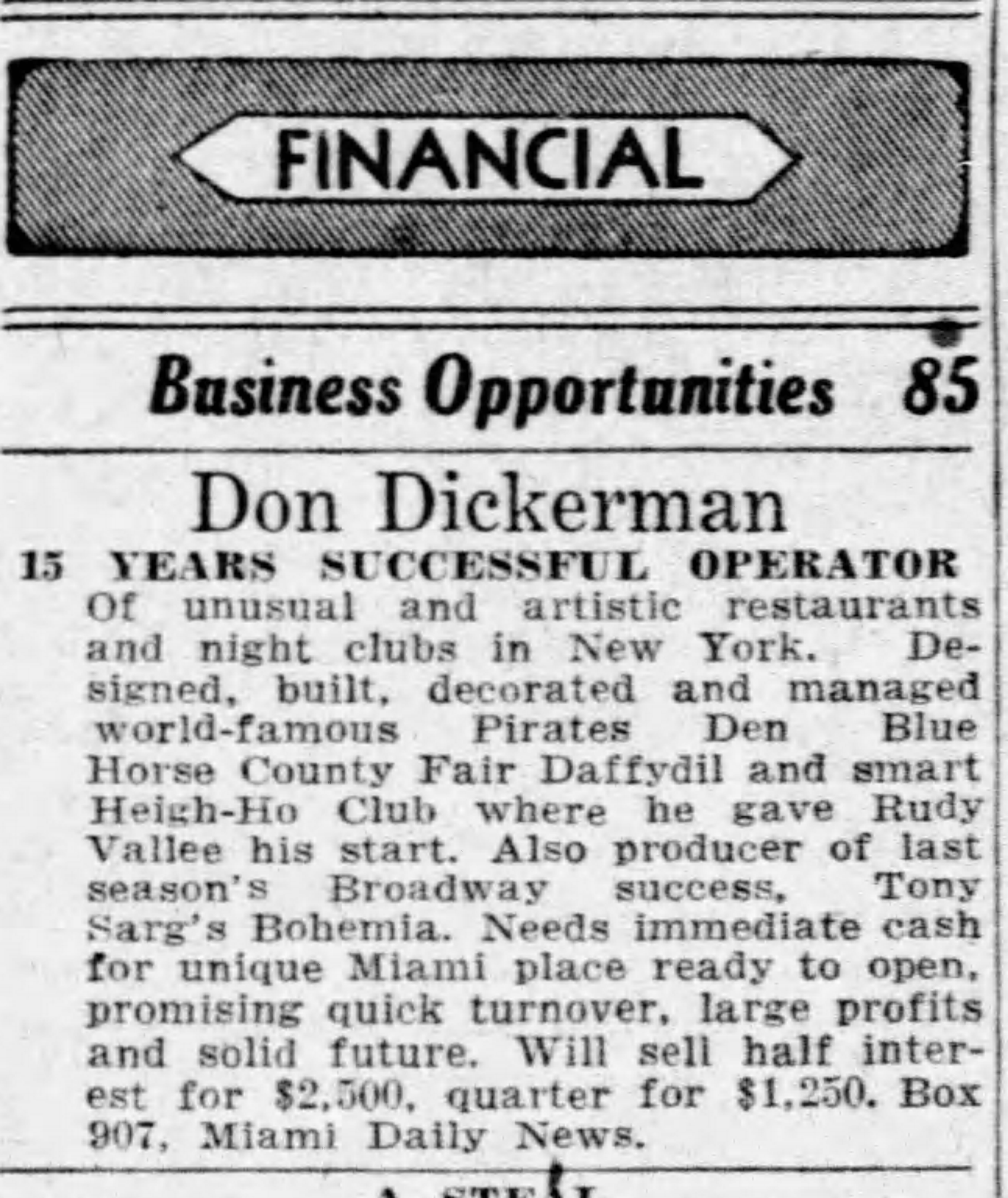 The Wooden Shoe had been built in 1939 for Harry Zody, as a replica of the old Rembrandt House in Amsterdam. Dickerman added a “merry mermaid” cocktail bar and a buccaneer quarterdeck. He sued his partners Harry K. Curtis and Wendela Drury, on January 25, 1944, asserting that the venue had been sold on January 10 and he had not received his third of the sale price. The Wooden Shoe became Moon Mullins’ Cafe in December 1945, then the Club Tabu as of November 1946.