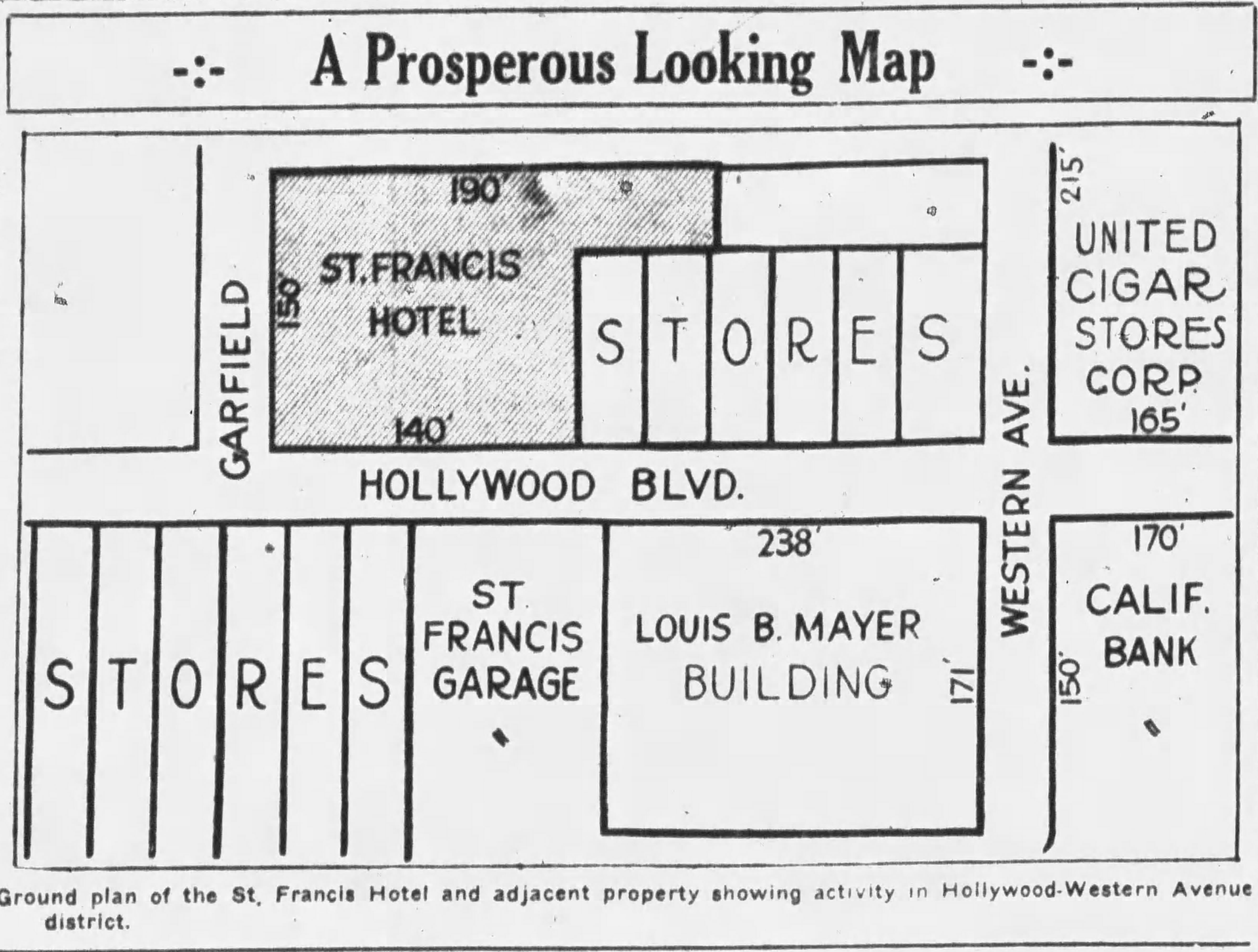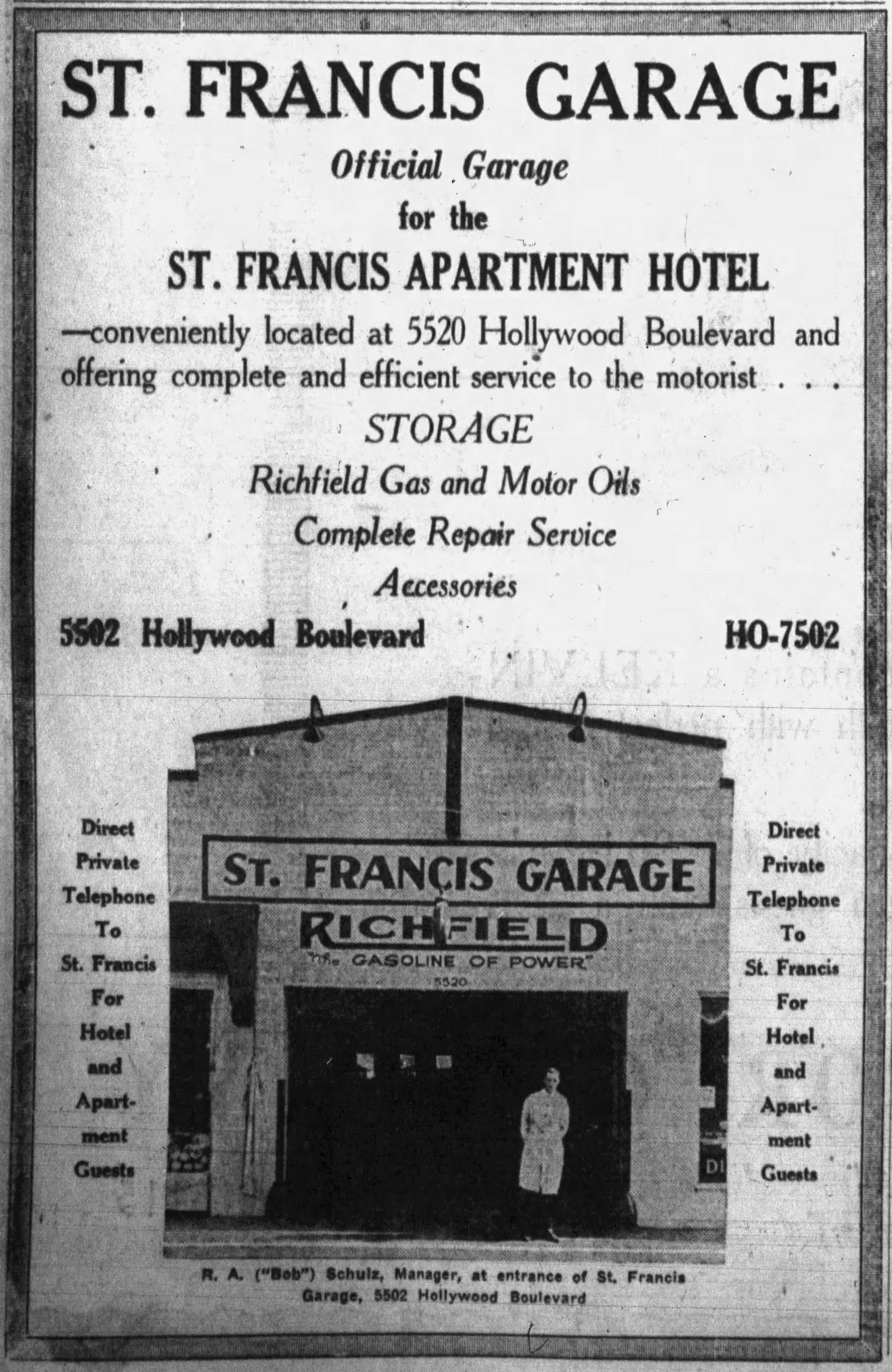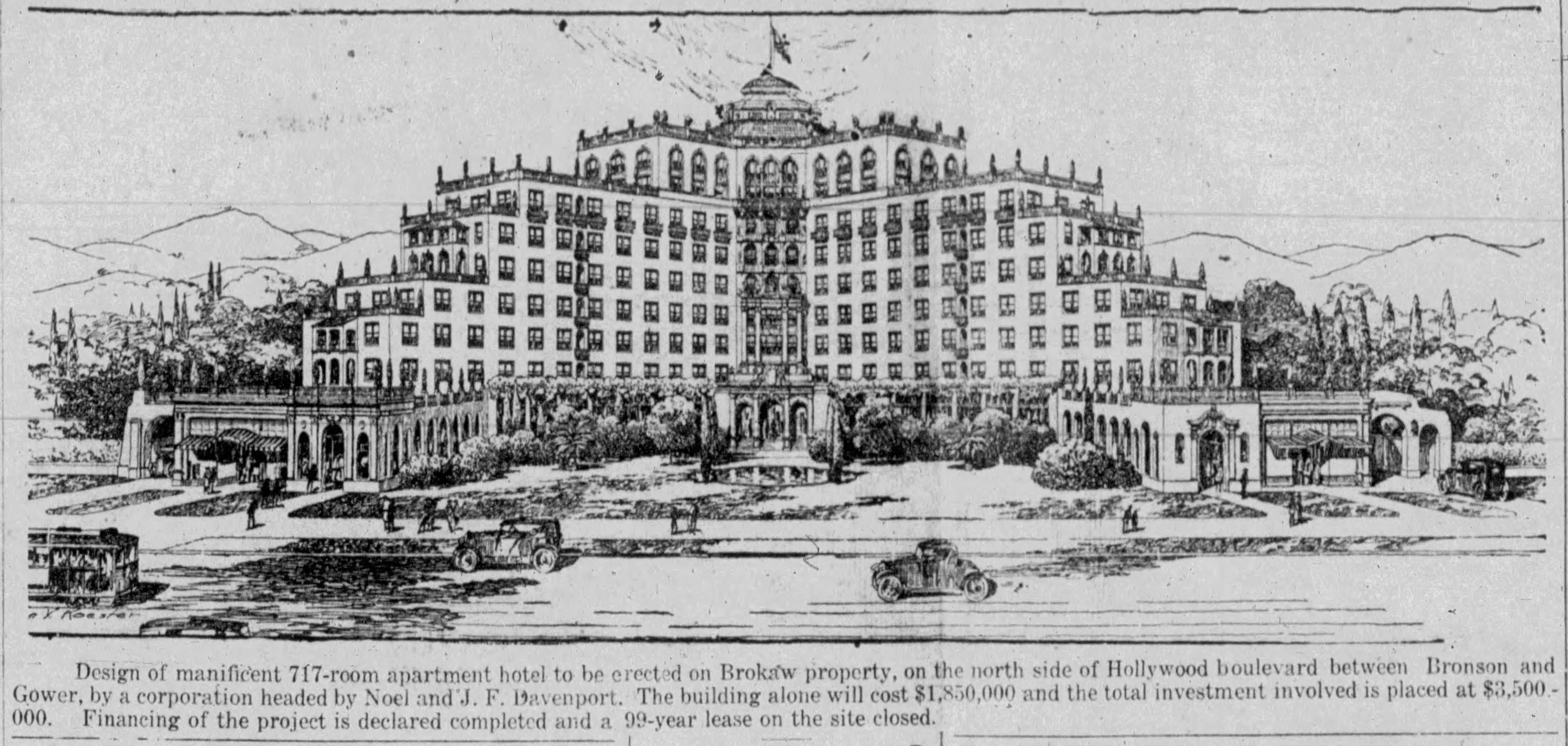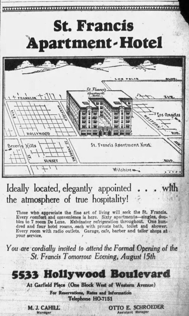 On March 24, 1927, ex-boxer / dentist Leach Cross opened a namesake cafe, the “Leach Cross Cafe” in the hotel’s ground floor retain space, addressed as 6160 Hollywood Boulevard.