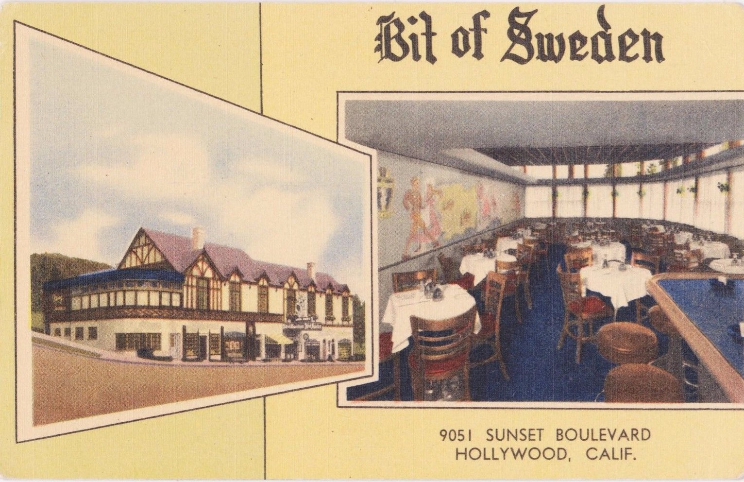 At the peak of its popularity in 1941, the Strip tried to promote itself as a place to visit day or night. “The Sunset Strip invites you…for leisurely shopping daytimes and evenings… away from the city’s crowds and noise and traffic…for the playtime of your life at world famous nightclubs…visit the Sunset Strip TODAY and TONIGHT.” Day shoppers and browsers could find art galleries, furriers and clothing boutiques, jewelers such as Paul Flato, antique dealers and decorators-to-the stars like Billy Haines at 8720 Sunset and Gilbert Adrian at 8606, and Elizabeth Arden’s Los Angeles salon at 8597. Diners had their choice of a variety of international cuisine, including Swedish smorgasbord, Russian, Hungarian, and English.