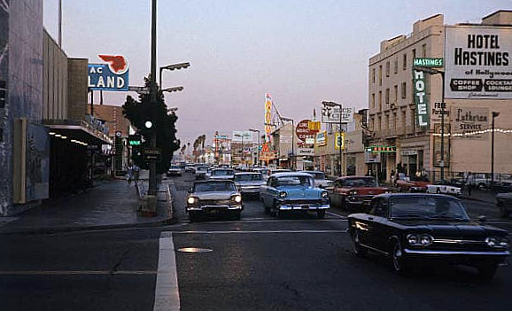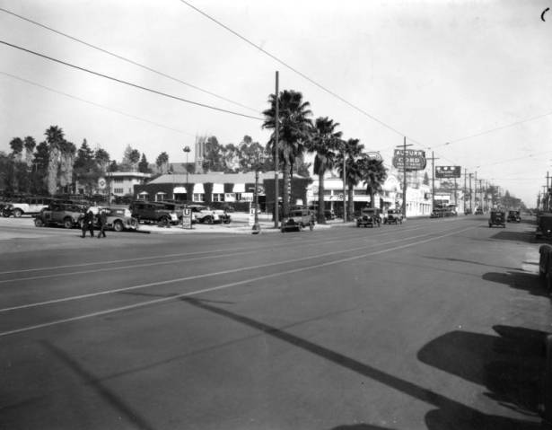 This section of the Boulevard was still fairly undeveloped at this point. The south side of the block was largely devoted to auto dealerships interspersed by the shaded lawns of the Mountain View Inn. Across the street, there was the Marcal Theater and some small retail buildings but the rural Brokaw property was still undeveloped, but for a defunct miniature golf course. That would change between the years 1936 and 1940 when the Palms Grill, Hawaii Theater, Florentine Gardens and Hollywood Food Mart were built.