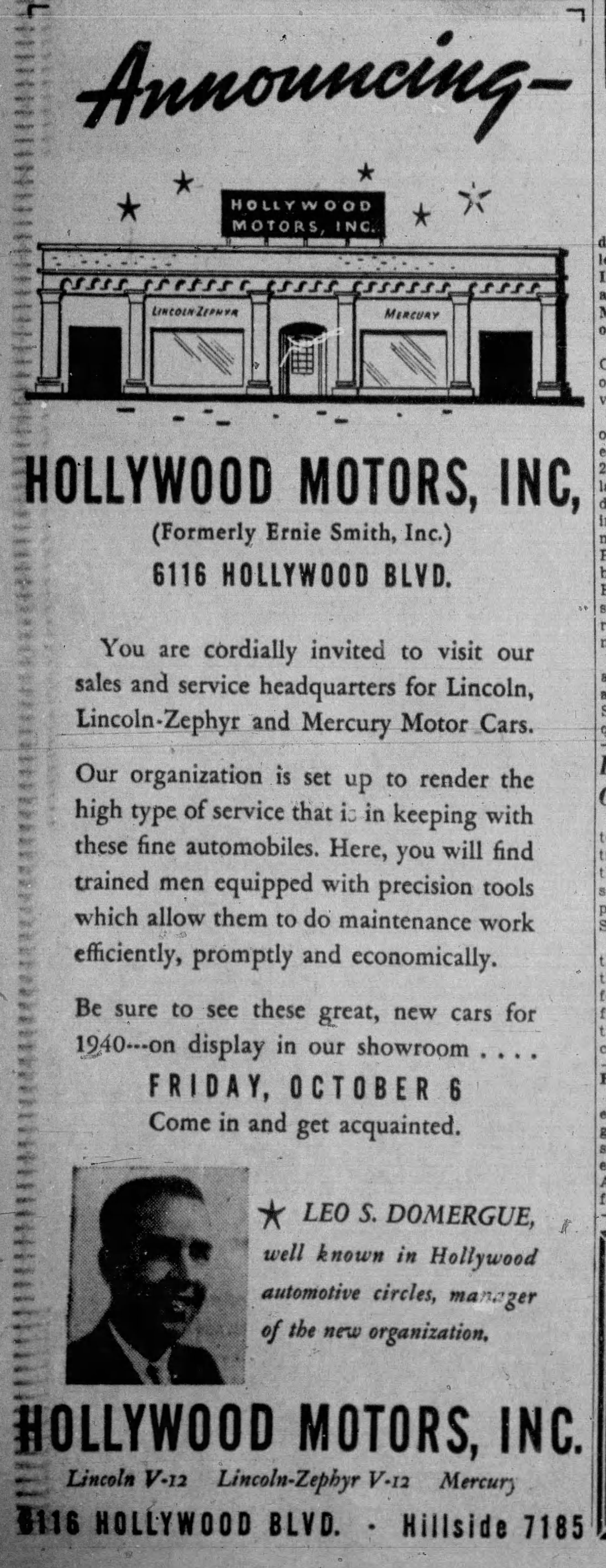 In October 1935, 6032 again became a Pontiac dealership when Pontiac dealer A. E. (Ab) England announced that he was moving into what he called “one of the finest and best equipped automotive establishments in the movie capital.” England and his brother C.P. England came to Hollywood from Phoenix, where they’d been in the auto business with their uncle O.T. England.