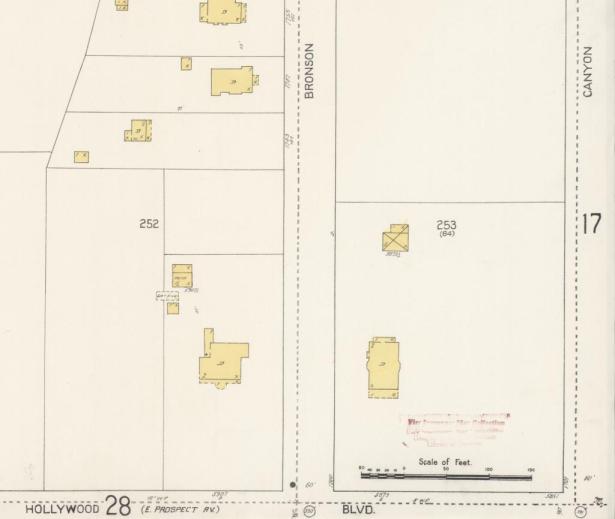 Detail of a 1913 Sanborn Fire Insurance Co. map for Hollywood. The parcel that became 6030-6038 was still vacant. The Rich family also owned both parcels directly to the east (6024-6028) and west (6048). Library of Congress map.