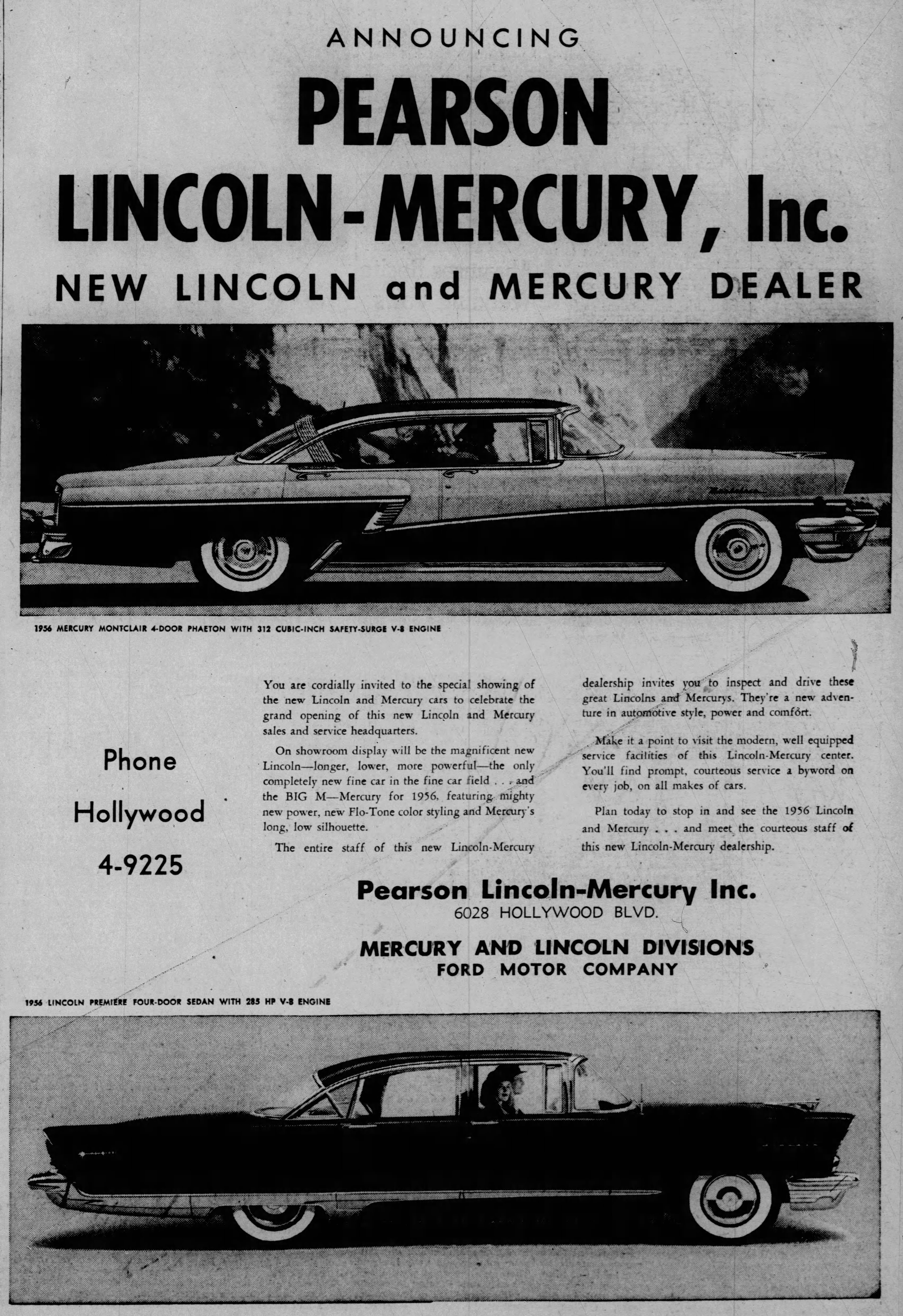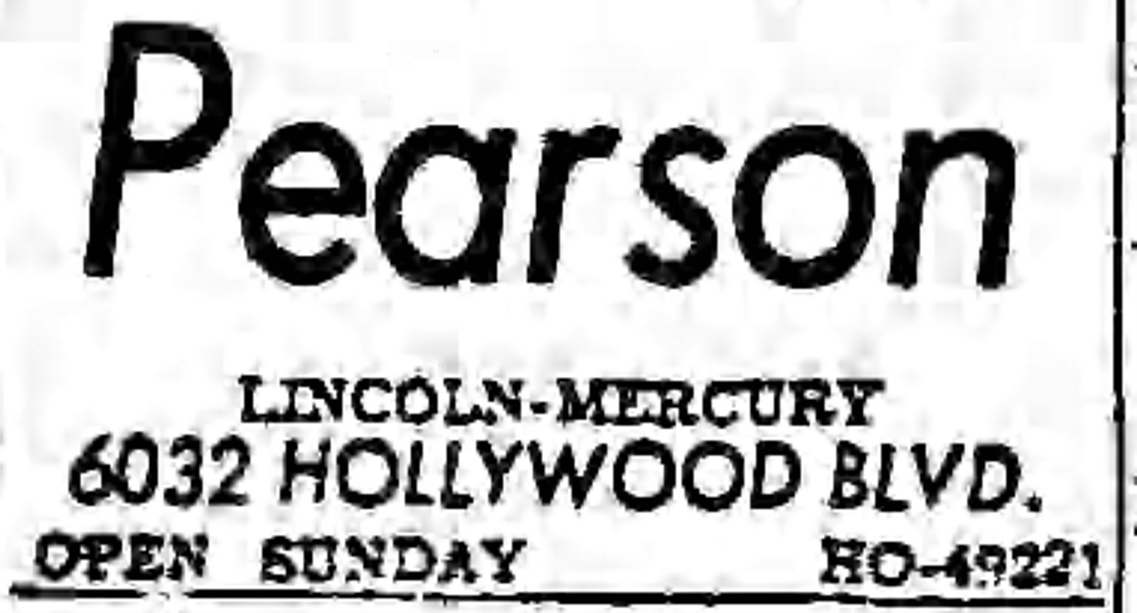 From January 1954 to May 1957, 6032 was used by J. F. O’Connor and Son Lincoln-Mercury, who had moved to 6028 in 1949, and then by O’Connor’s successor, Pearson Lincoln-Mercury. By this time both parcels were owned by Mark M. Hansen of the Marcal Theater and his wife Ida. Hansen had acquired 6032 by 1940 and 6028 as of 1952 for sure. Pearson left in May 1957 when Hollywood Ford took over 6028 Hollywood Boulevard. Likely Ford was using this property as well.