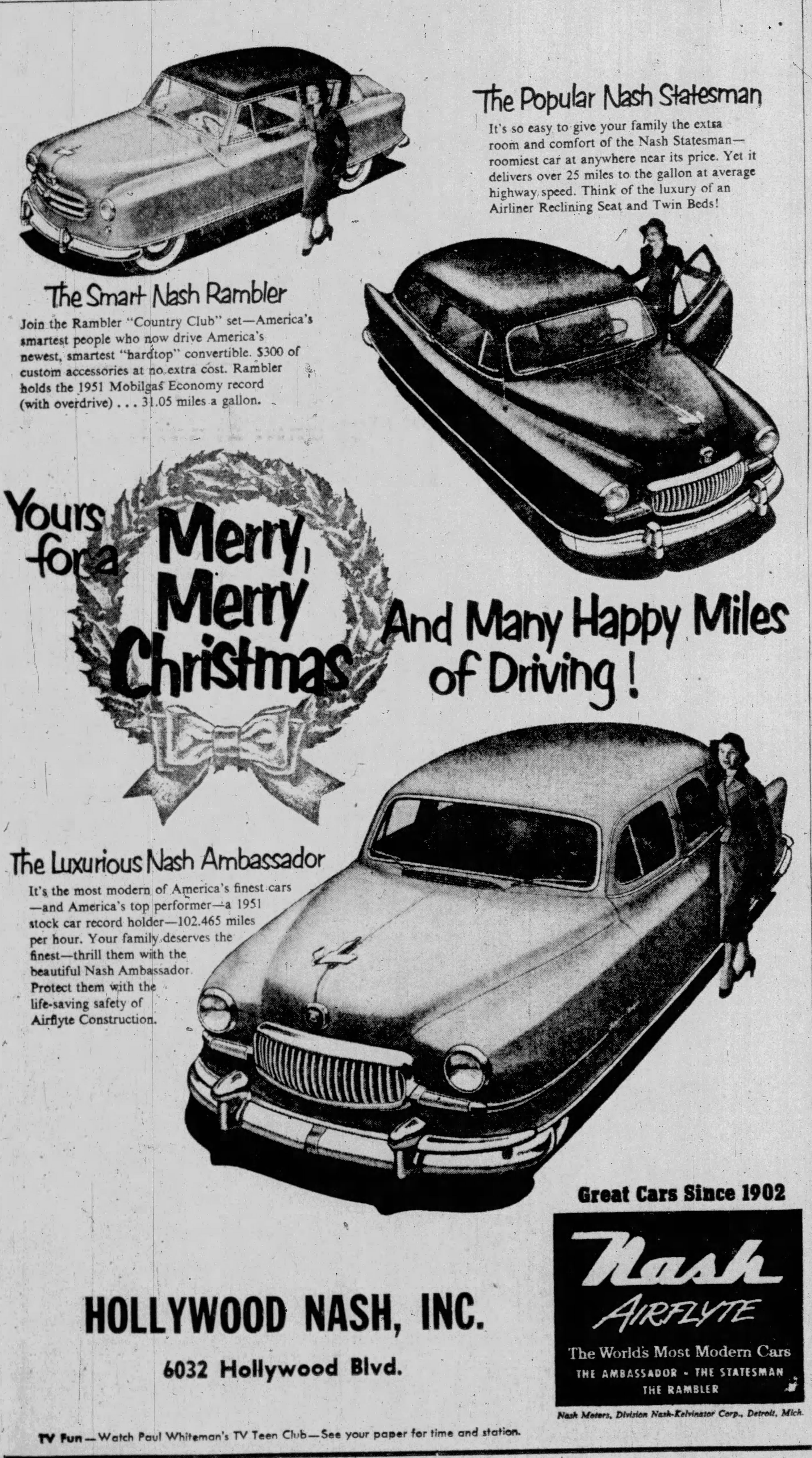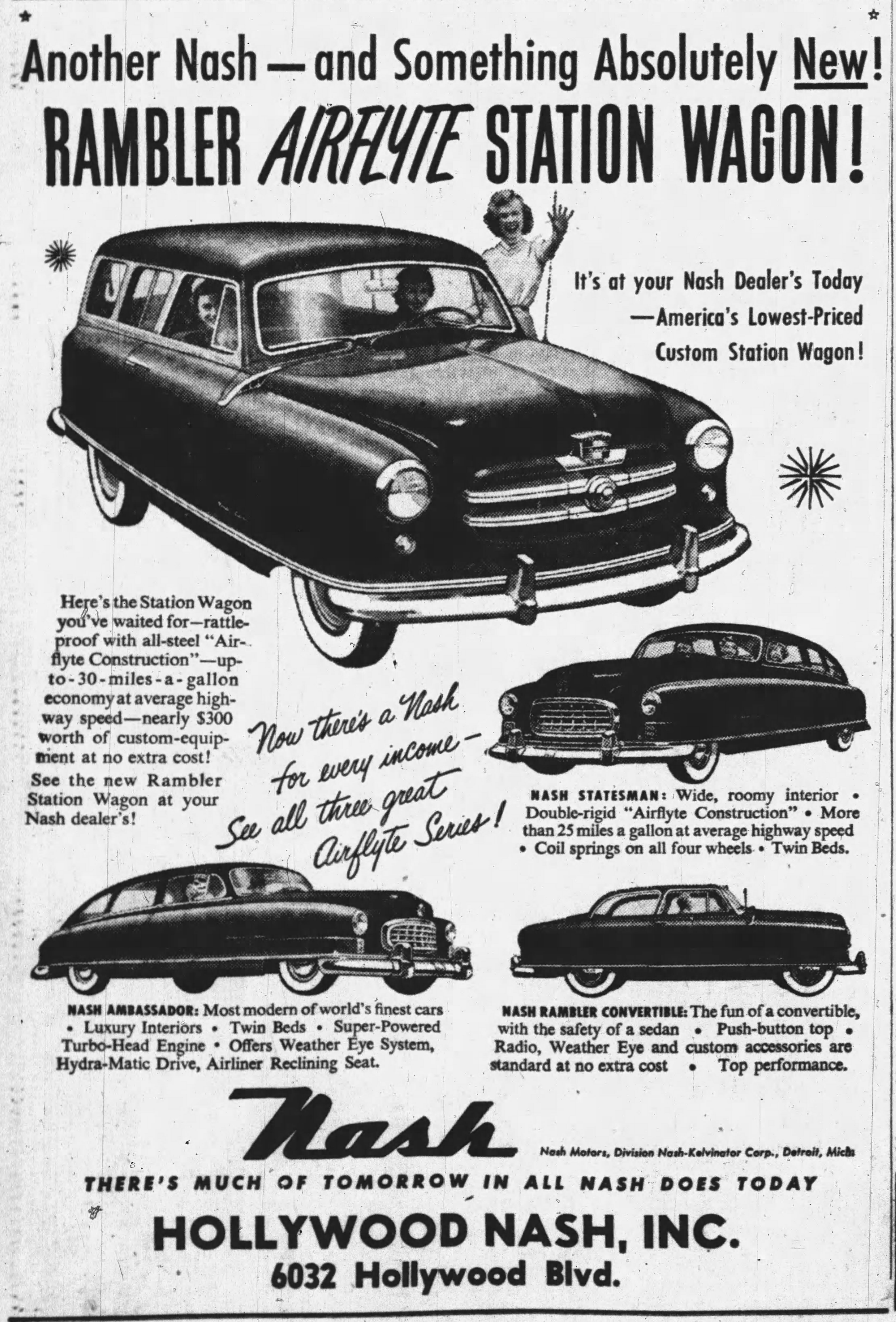 Twin beds? Yes, the Nash Ambassador and Nash Statesman features fold-down front seats that made into a bed. The “Weather Eye” was the heating and air-conditioning system. Hollywood Citizen News 6/23/1950.